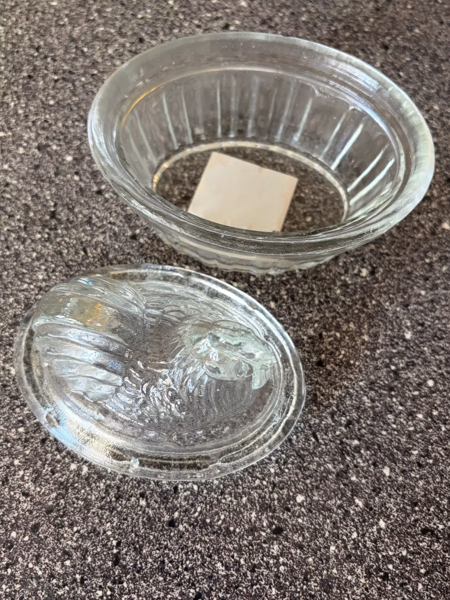 Sælger denne klassiske og charmerende låghøne i klart glas. En absolut retro-favorit, der er perfekt som pynt til påskebordet eller som dekorativ opbevaring året rundt.