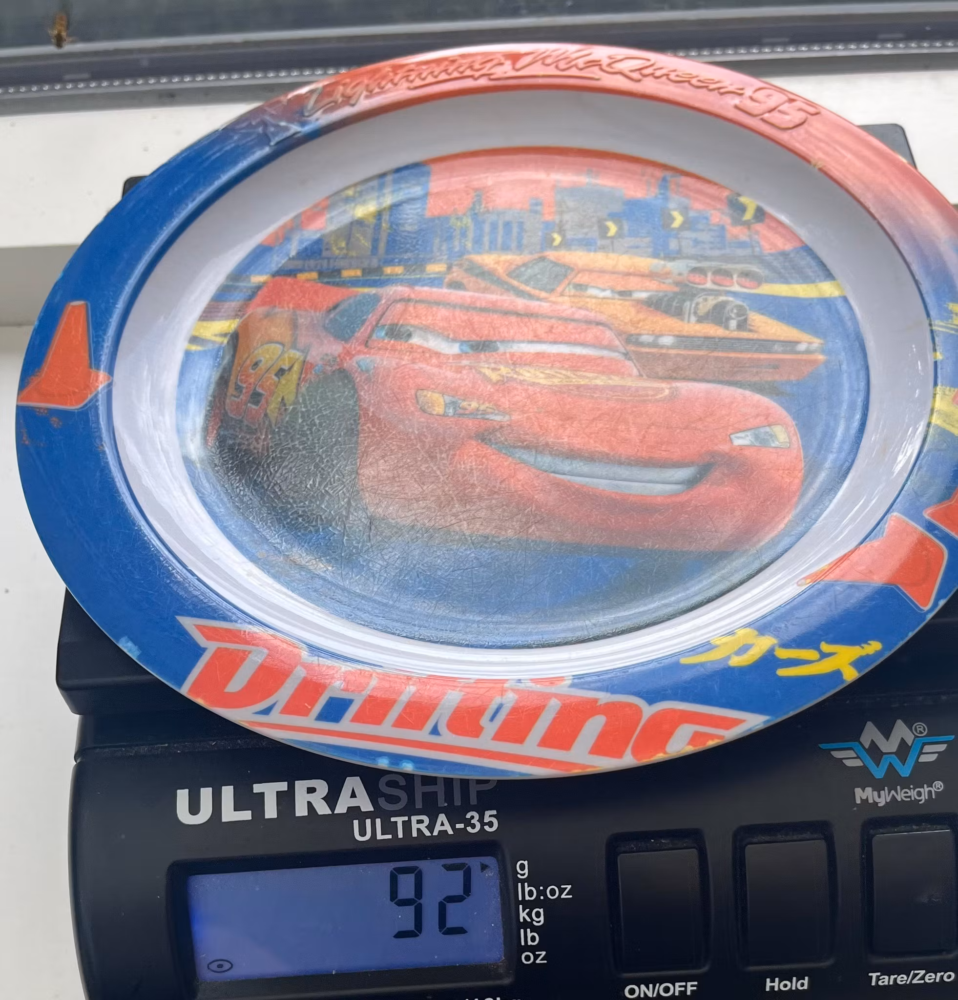 Børne tallerken med motiver fra Disney/Pixar-filmen "Biler" (Cars), med Lynet McQueen som det centrale motiv.