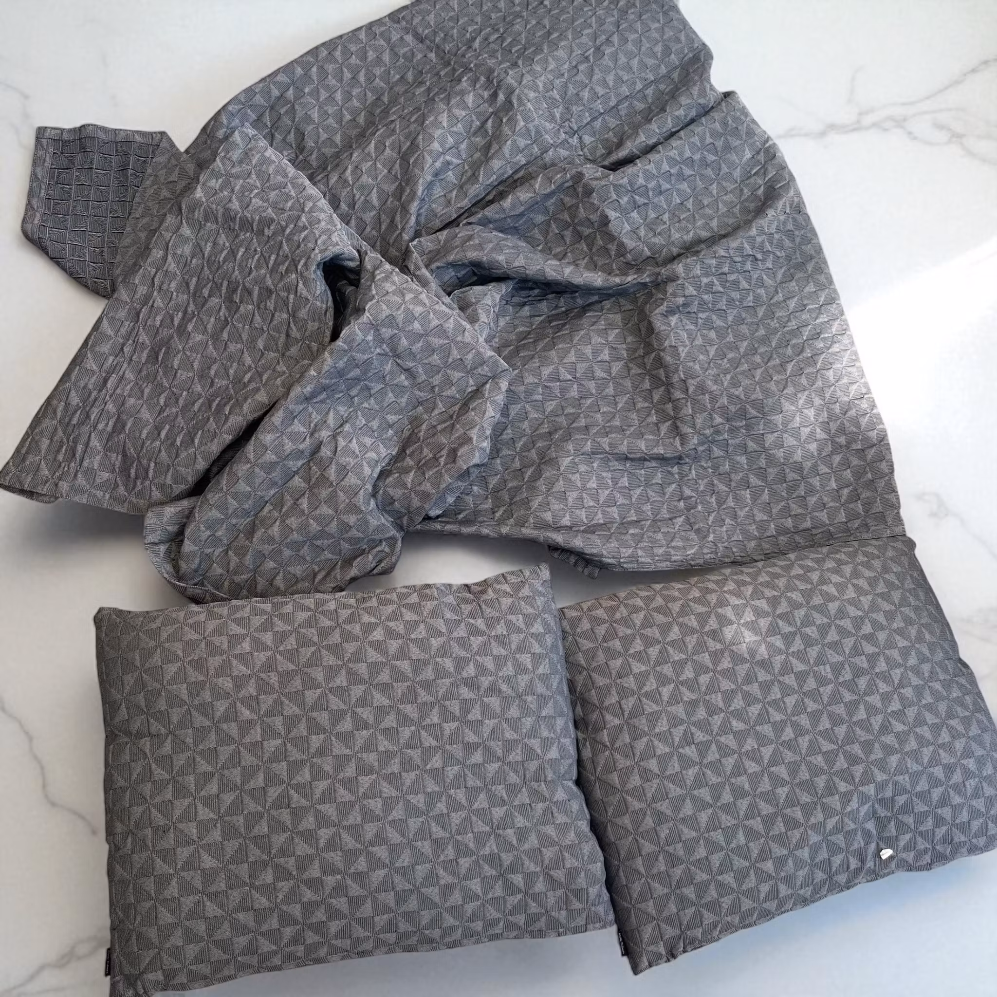 Billedet viser en foldet tæppe) og to matchende pyntepuder med et ensartet, vaflet eller quiltet mønster.