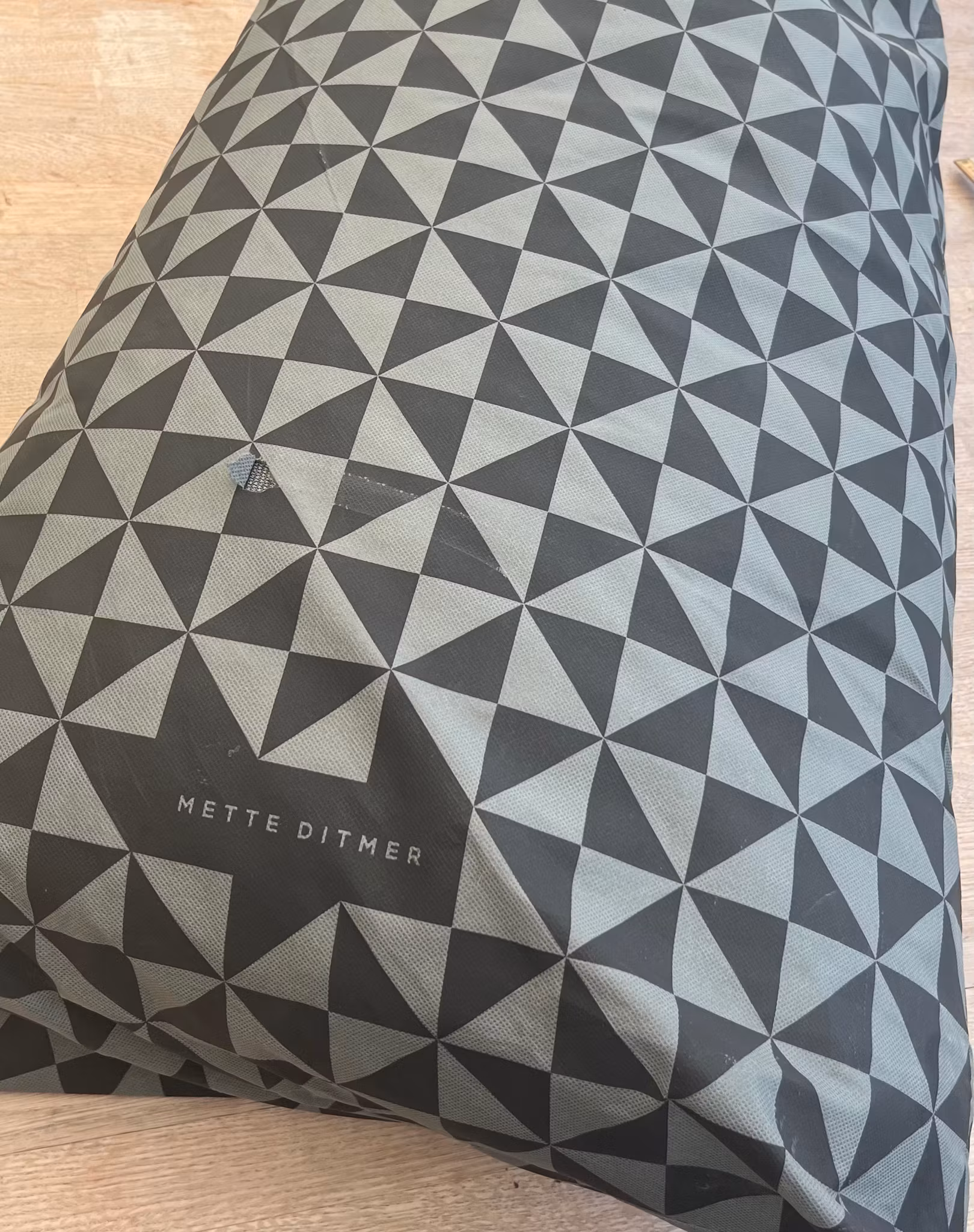 Mønsteret og stilen stemmer overens med Mette Ditmers design, som er kendt for farverige pyntepuder og boligtekstiler af høj kvalitet.