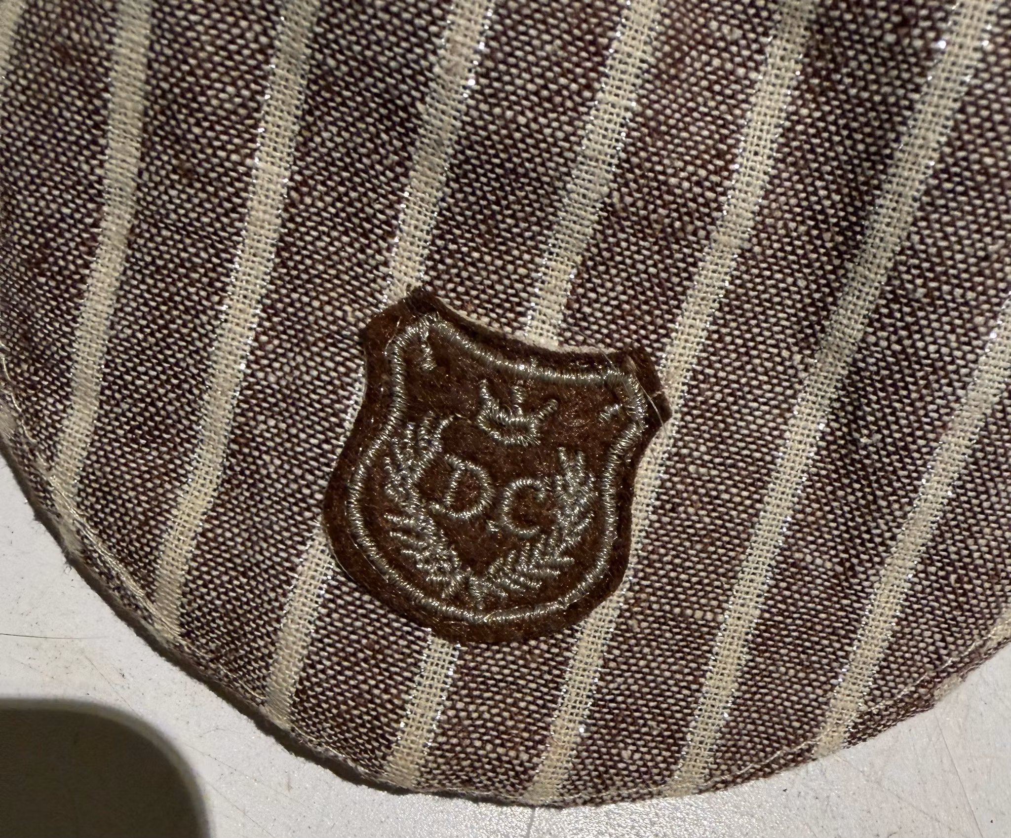 Hatten har et tidløst design med mørkebrune og hvide striber og et flot "DC" emblem foran, der giver et lille vintage-touch. Perfekt til barneåb, fødselsdage eller bare til at fuldende et smart hverdagsoutfit.