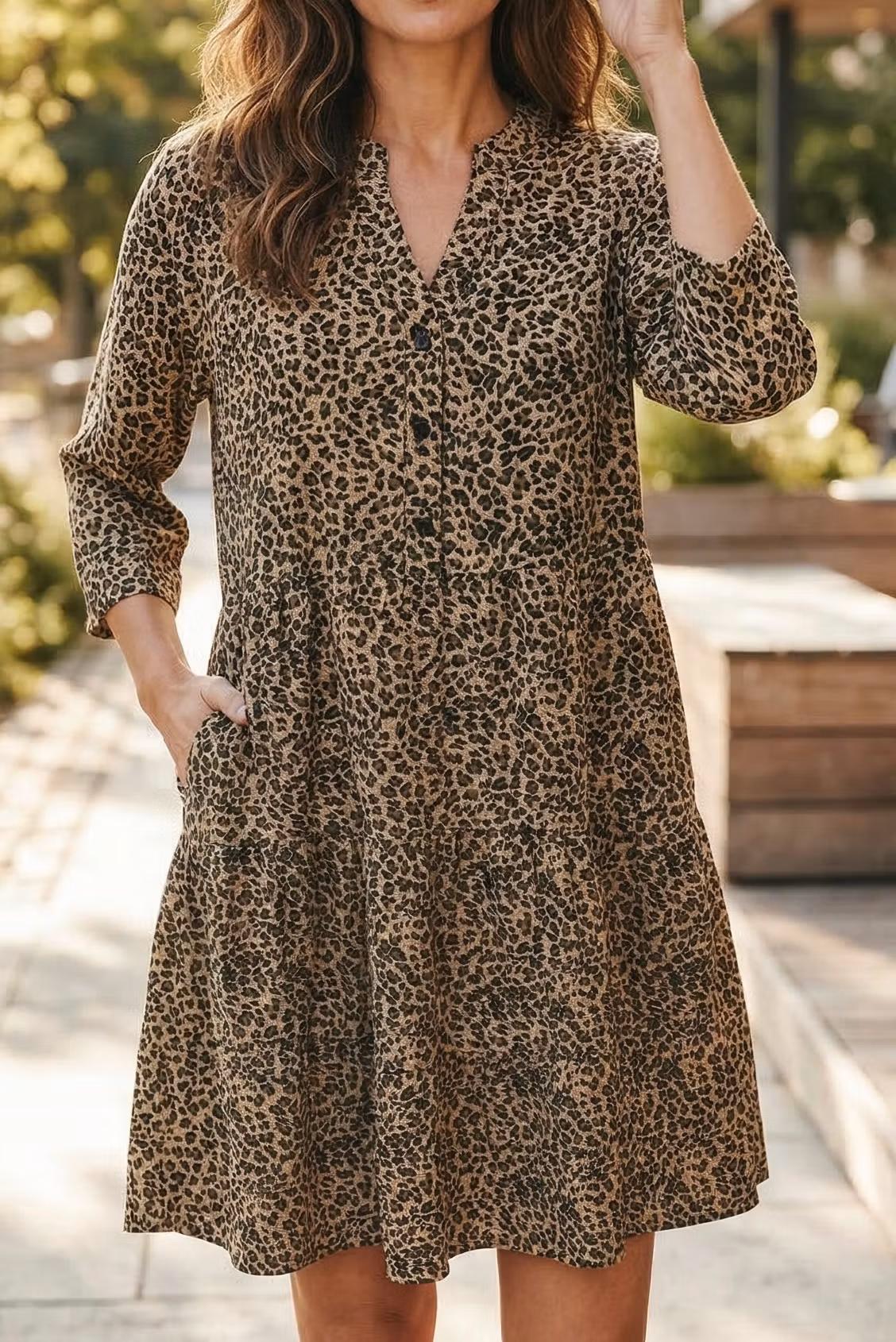 - Tryk: Et klassisk og tidløst leopardprint . Mønsteret består af sorte og mørkebrune pletter på en lys beige eller sandfarvet baggrund.