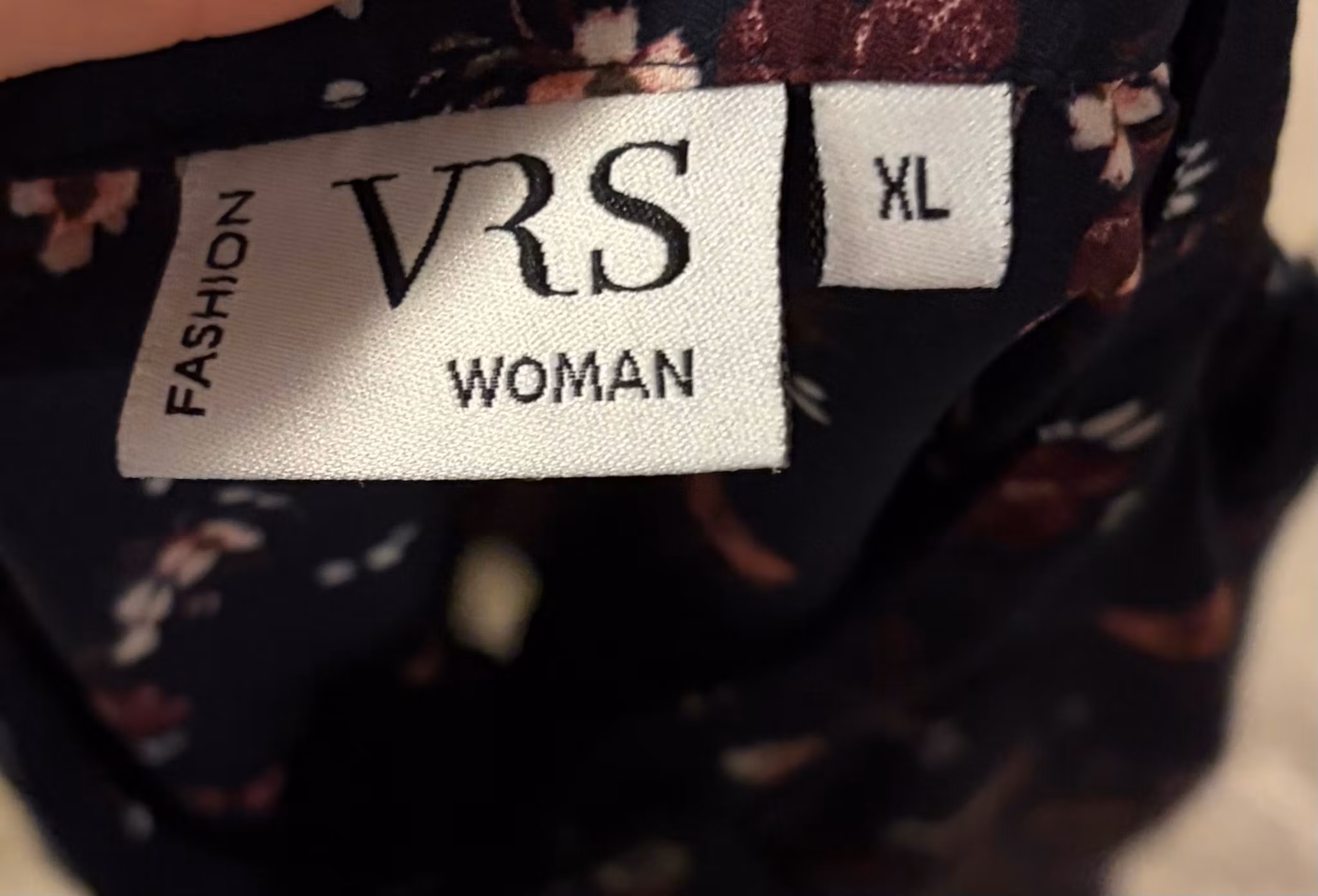 - Tryk: Et smukt, småblomstret mønster i nuancer af mørkerød, hvid og fersken på en klassisk mørkeblå baggrund.