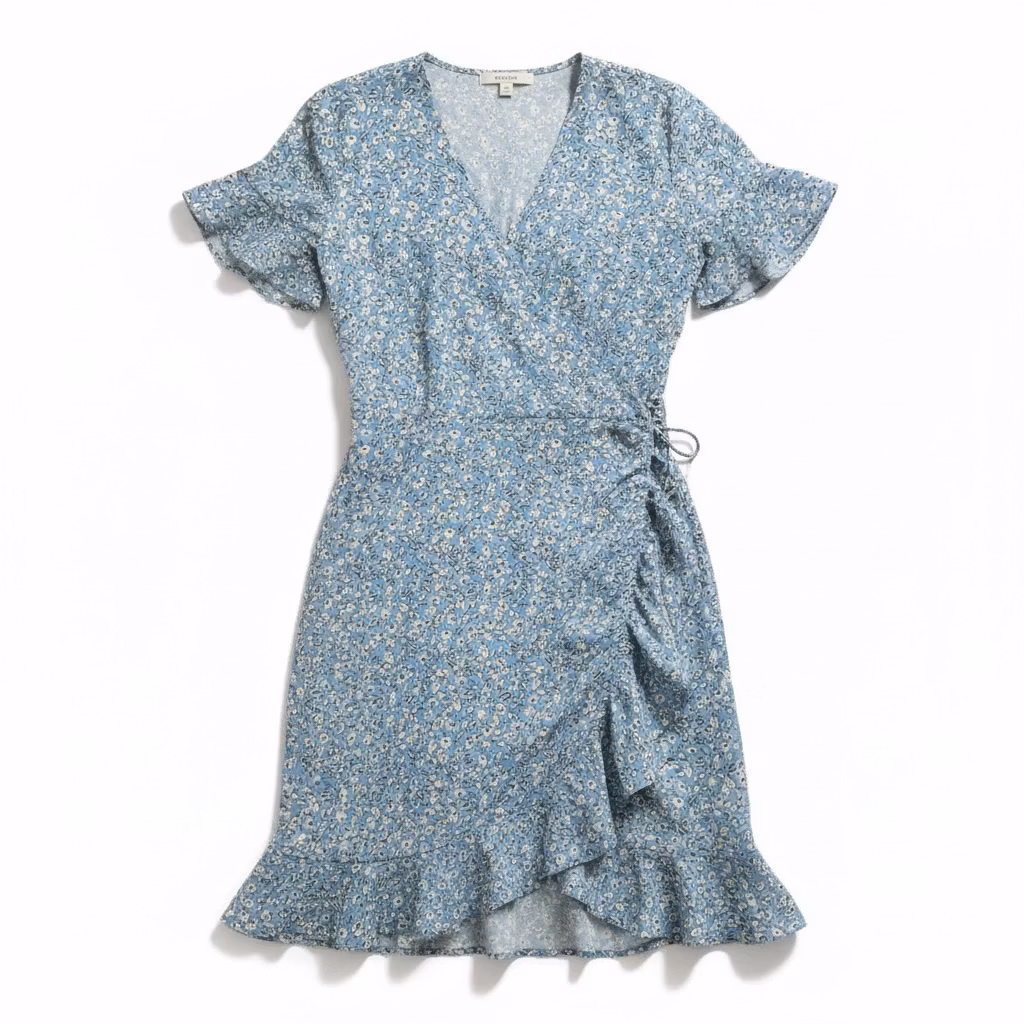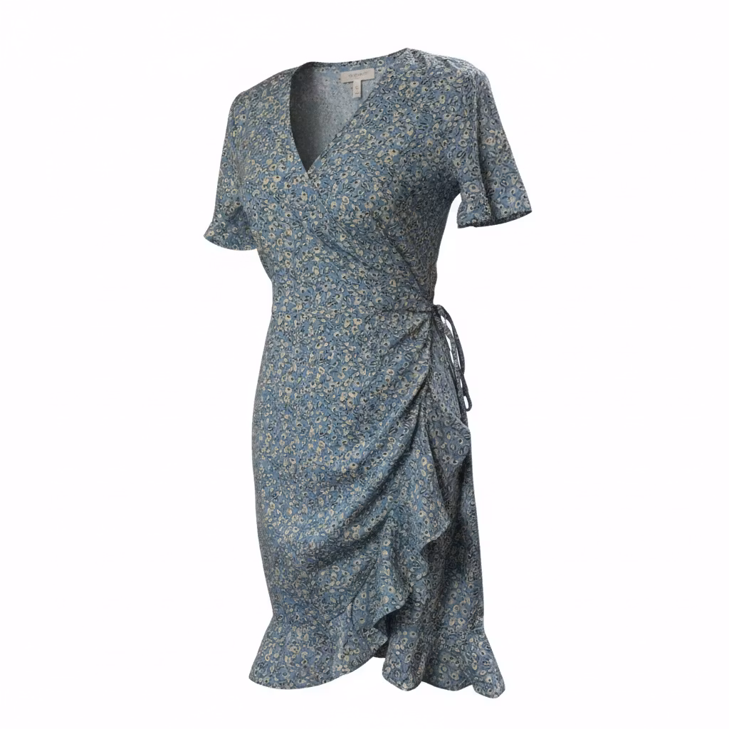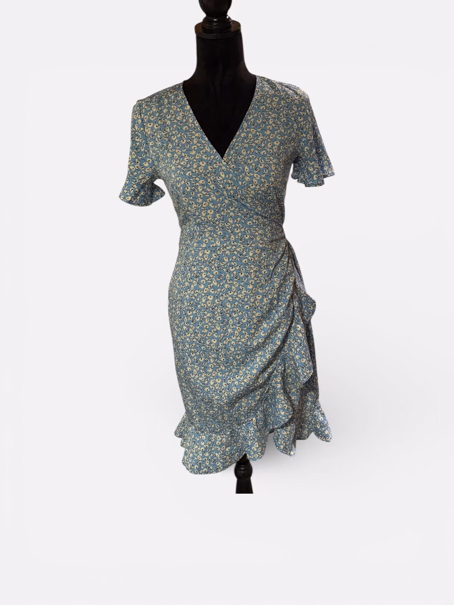 - Stil: Slå-om-kjole (omslagskjole) med V-udskæring, korte flæseærmer og flæsedetaljer i bunden, der giver en feminin silhuet.