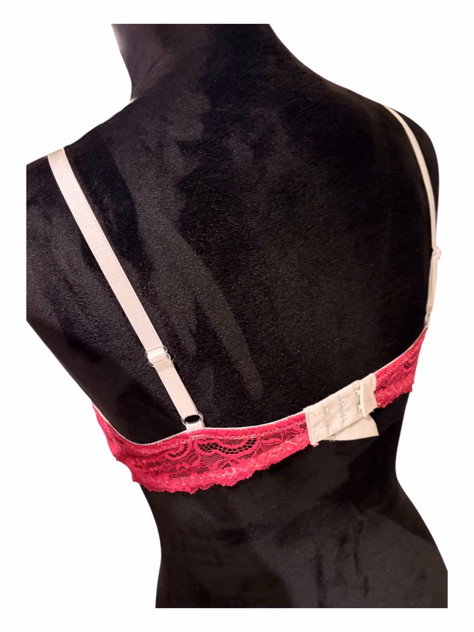 Modellen er udført i fine, detaljerede blomsterblonder i en iøjnefaldende hindbærrød farve, der komplementeres af kontrasterende, lyse skulderstropper.
