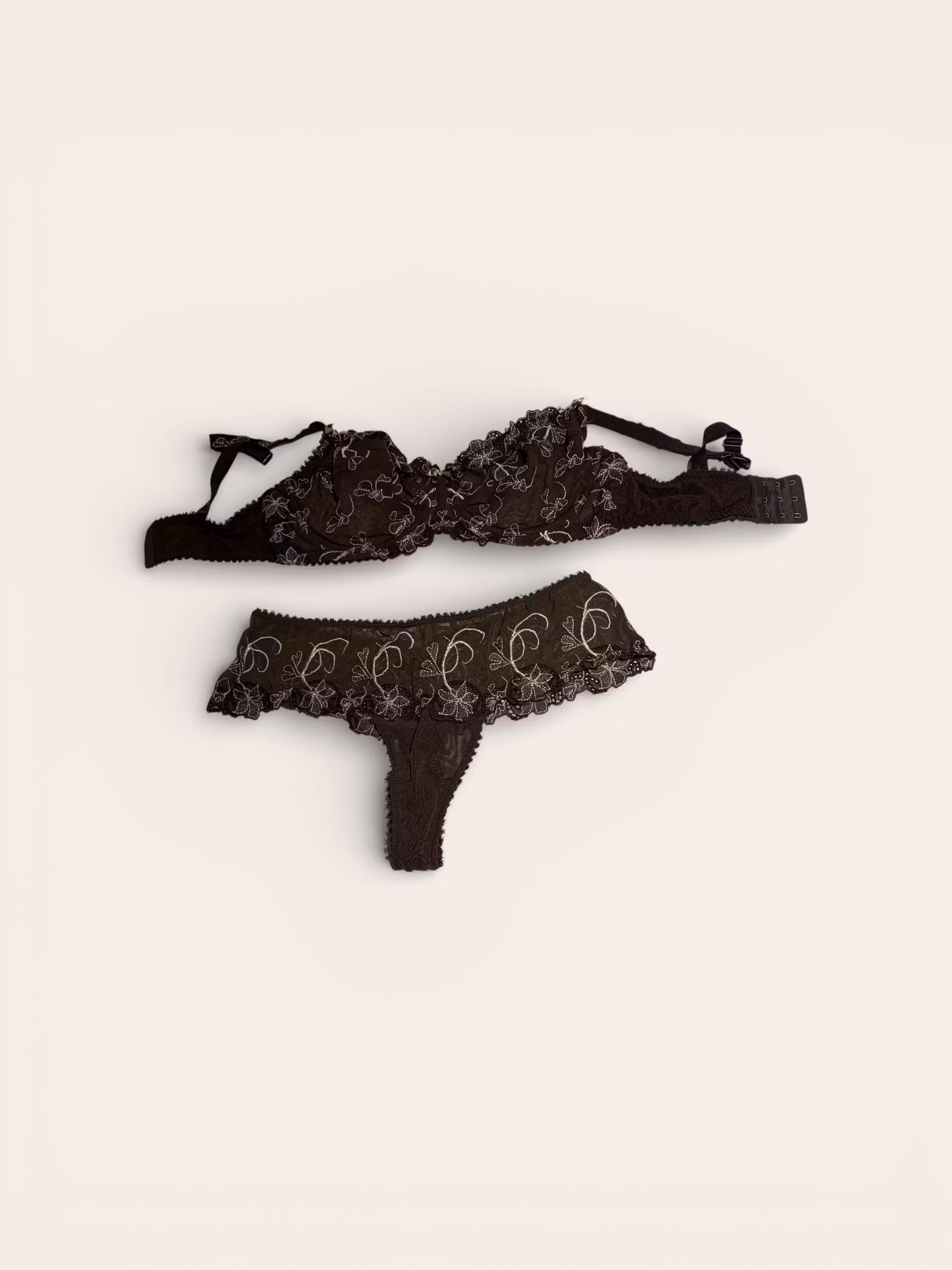 Trusser: Matchende g-streng/string med de samme smukke broderier og gennemsigtige detaljer, der fuldender det elegante look.