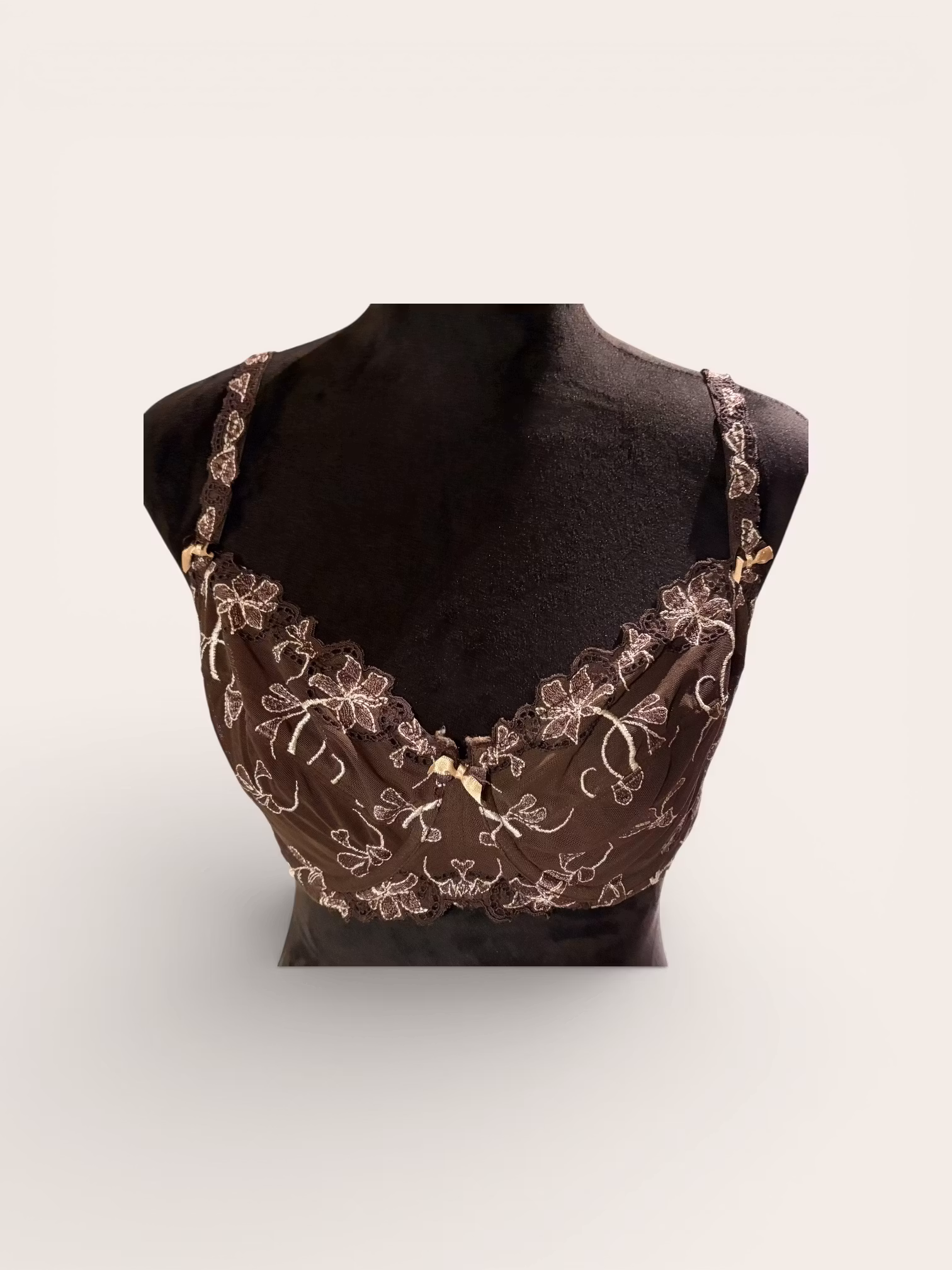 BH: Elegant balconette-model (halv kop) med bøjle, som giver et naturligt løft. Skålene er prydet med detaljerede, lyse blomsterbroderier på transparent mesh.