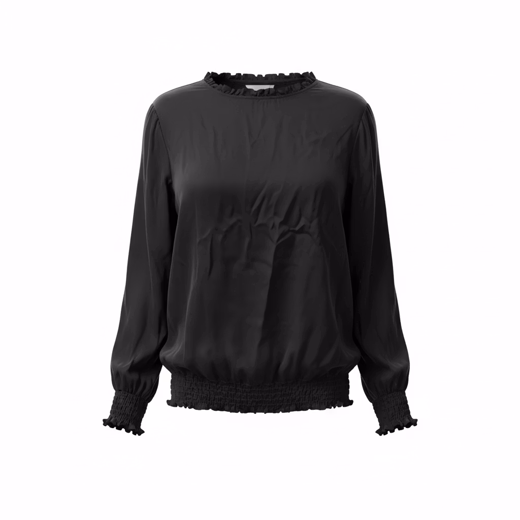 - Design: Rund hals med fine rynkedetaljer og en lille knaplukning i nakken.