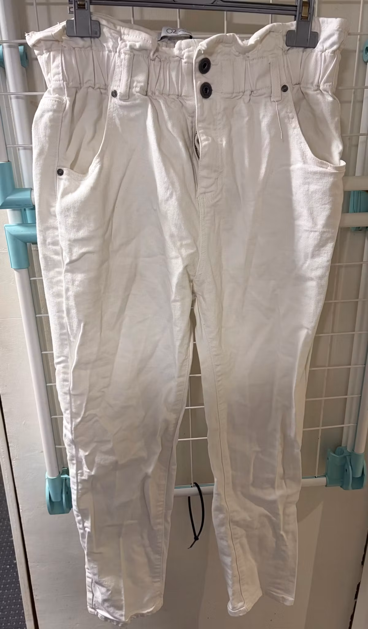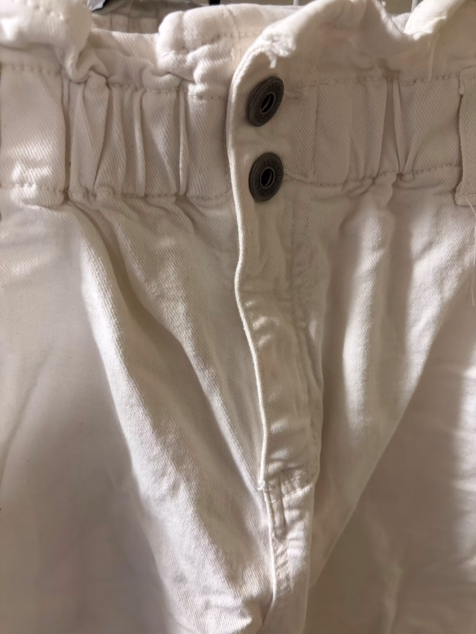 Super flotte og behagelige bukser fra det spanske mærke Q2 i en klassisk råhvid farve. Bukserne har den populære paperbag-talje med en bred elastik og en dekorativ dobbelt knaplukning, som giver en rigtig god pasform og markerer taljen flot.