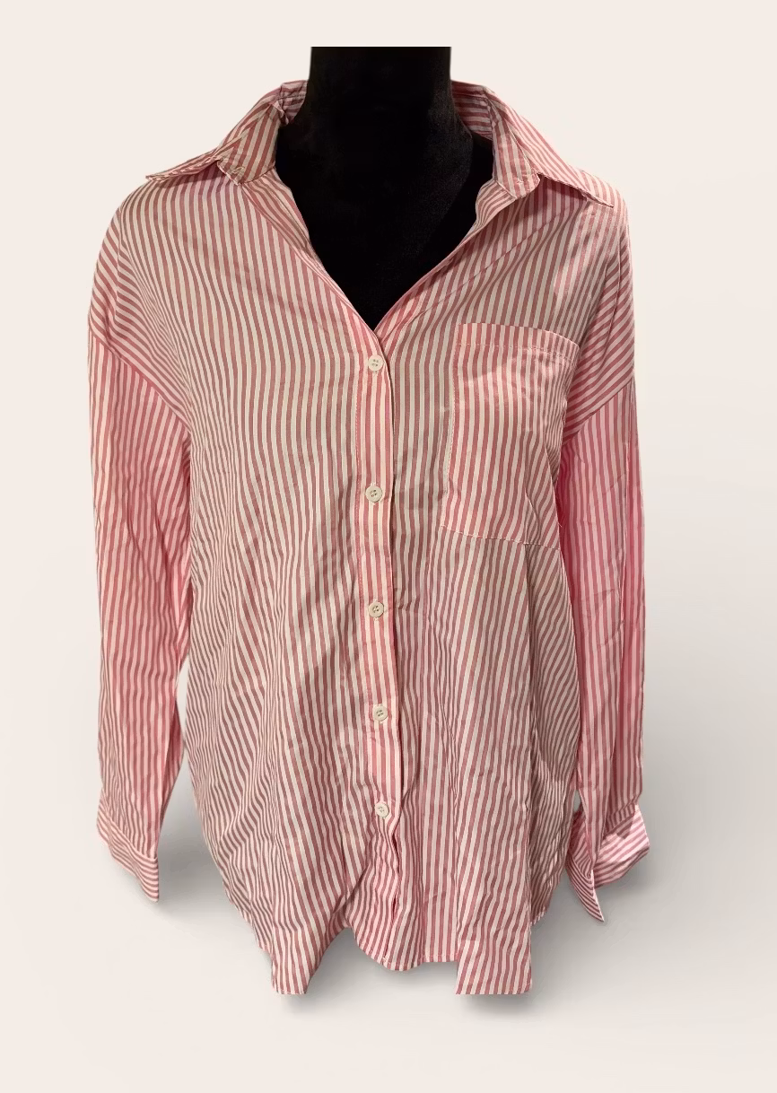 Stribet Oversize Skjorte - str. 36 25,- Har 2 på lager - vælg antal Design: Klassisk oversized skjorte med gennemgående lodrette striber i lyserød og hvid . Detaljer: &n På lager Tilføj til kurv Lagersaldo: 2 Del Information Anmeldelser Har 2 på lager - vælg antal Design: Klassisk oversized skjorte med gennemgående lodrette striber i lyserød og hvid . Detaljer: Traditionel skjortekrave, brystlomme og knaplukning med hvide knapper.Pasform: Løst "boyfriend"-snit med lave skuldersømme og lange ærmer med manchetter.Materiale: Letvægtsstof (typisk polyesterblanding), der er nemt at vedligeholde.Styling: Perfekt til både jeans og som et let lag over en top.