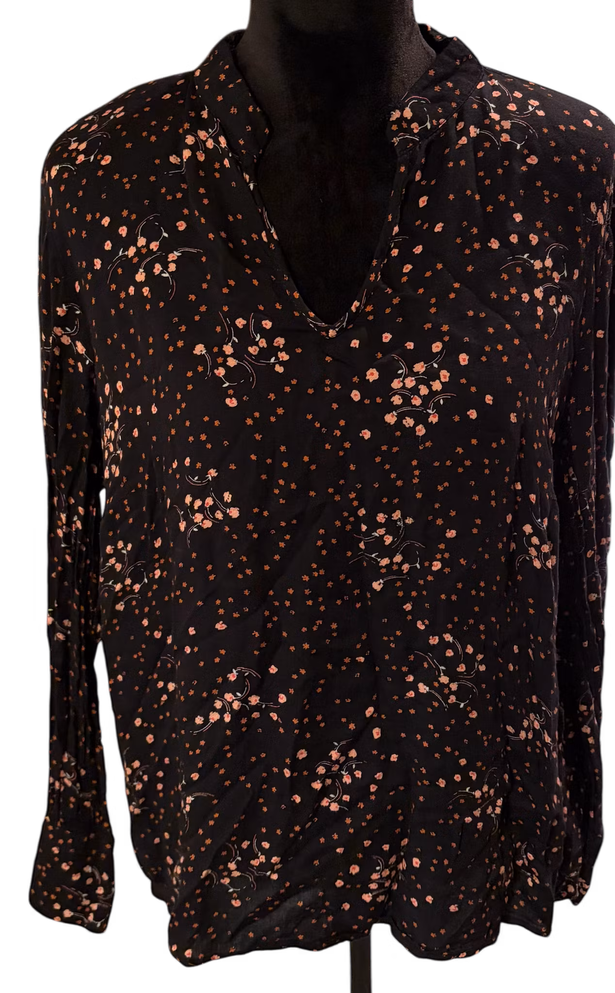 bluse med et romantisk udtryk, kendetegnet ved sit småmønstrede blomsterprint på en sort baggrund.