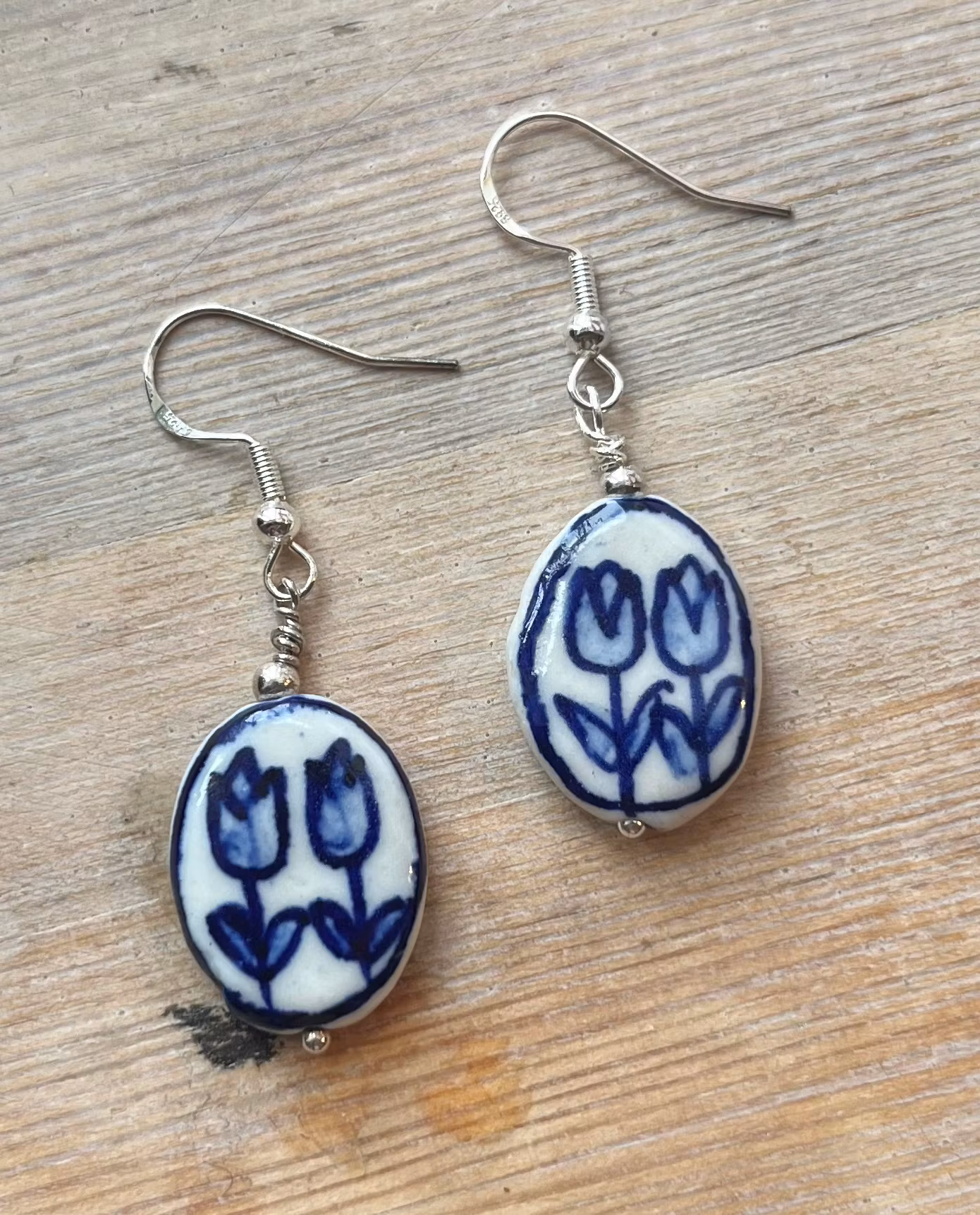 Disse charmerende øreringe er inspireret af den klassiske Delfter blå keramiktradition og har et smukt tulipanmotiv i dybblå nuancer på hvidt porcelæn. Hver ørering er omhyggeligt udformet med en glaseret finish og hænger elegant fra sølvfarvede ørekroge. De er et ideelt valg for dem, der sætter pris på tidløst hollandsk design og et feminint touch. Perfekte som en gave eller til at tilføje et unikt element til din egen smykkesamling