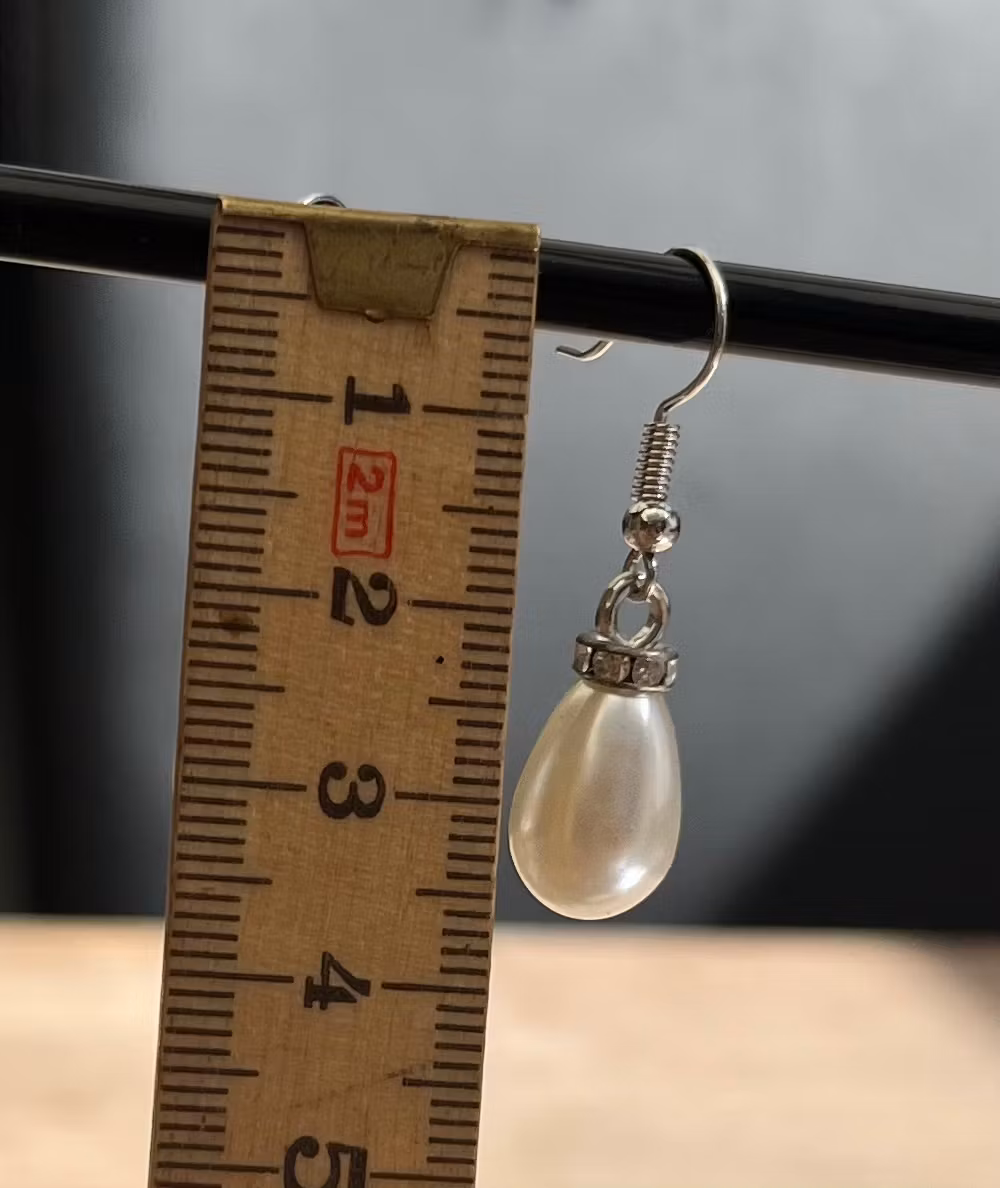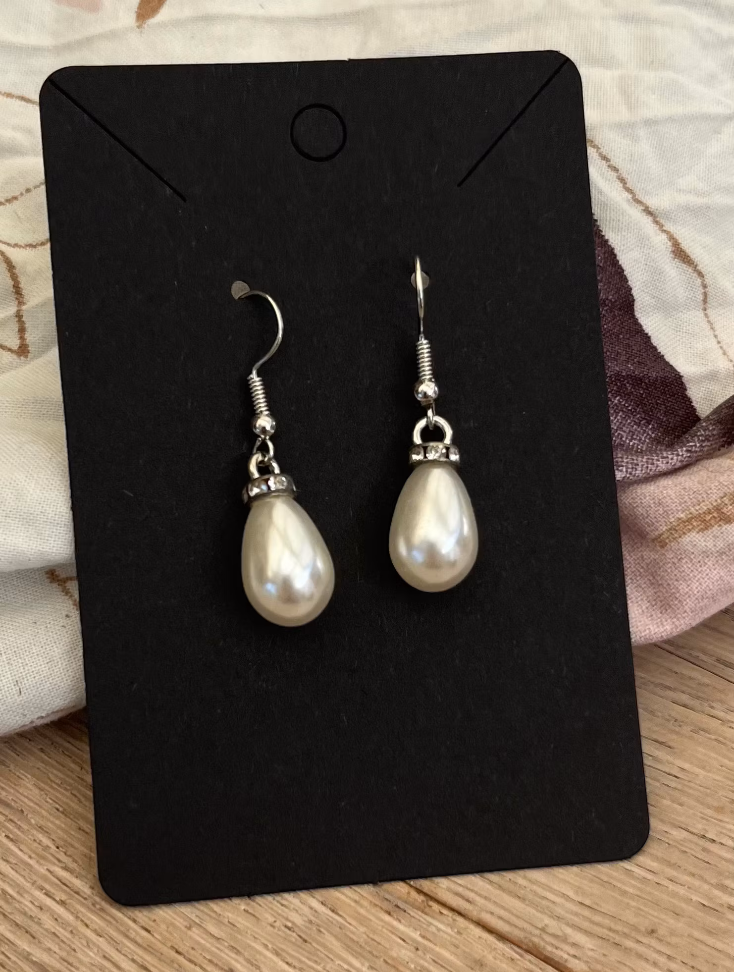 Øreringene har en yndefuld dråbeformet perle, der hænger elegant fra en sterling sølv krog. Perlen er omkranset af små, skinnende detaljer ved ophænget, der tilføjer et diskret glimt.