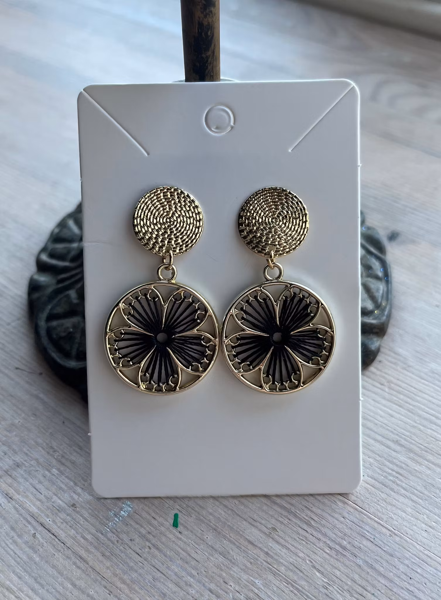 Disse smukke øreringe kombinerer klassisk elegance med et moderne twist. De er designet med en rund, guldtonet topdel med et fint flettet eller ringmønster, der tilføjer tekstur og dybde. Nedenunder hænger en større, guldtonet filigranring, der indkapsler et iøjnefaldende sort design, der minder om et stiliseret blomstermotiv eller et grafisk mønster. Den sorte detalje skaber en smuk kontrast til den gyldne ramme og giver øreringene et sofistikeret udtryk. Perfekte til at tilføje et strejf af raffinement til både hverdagslook og festlige lejligheder.