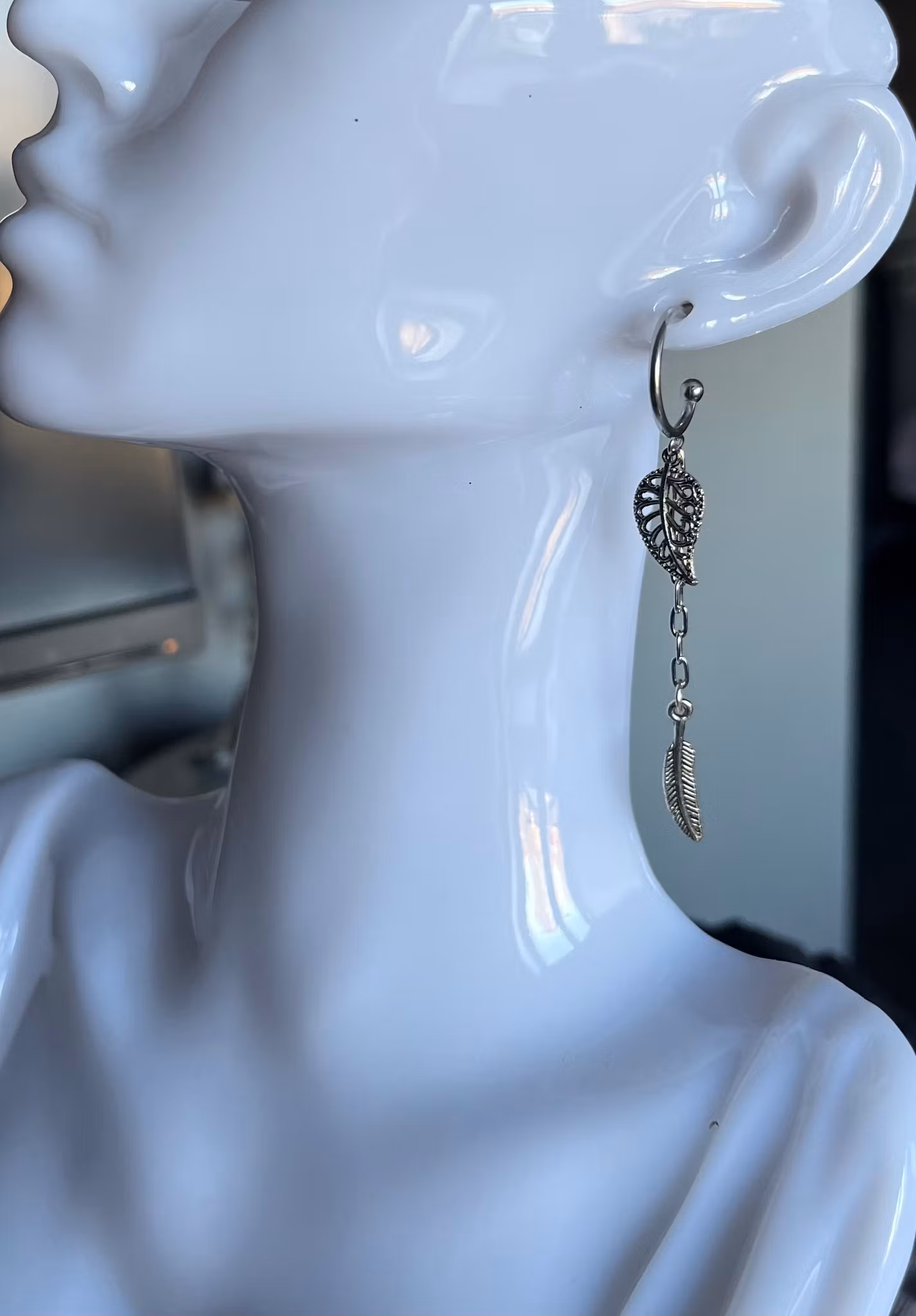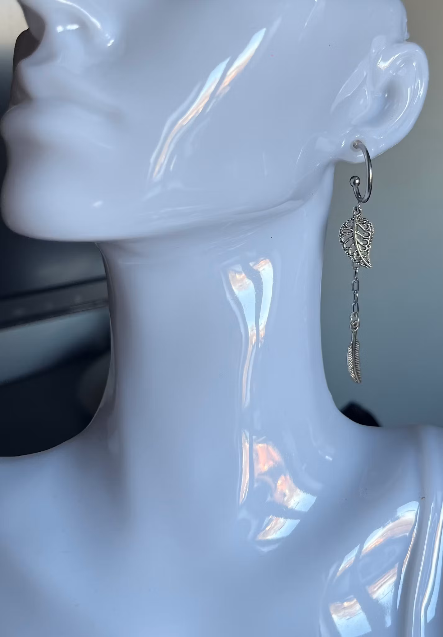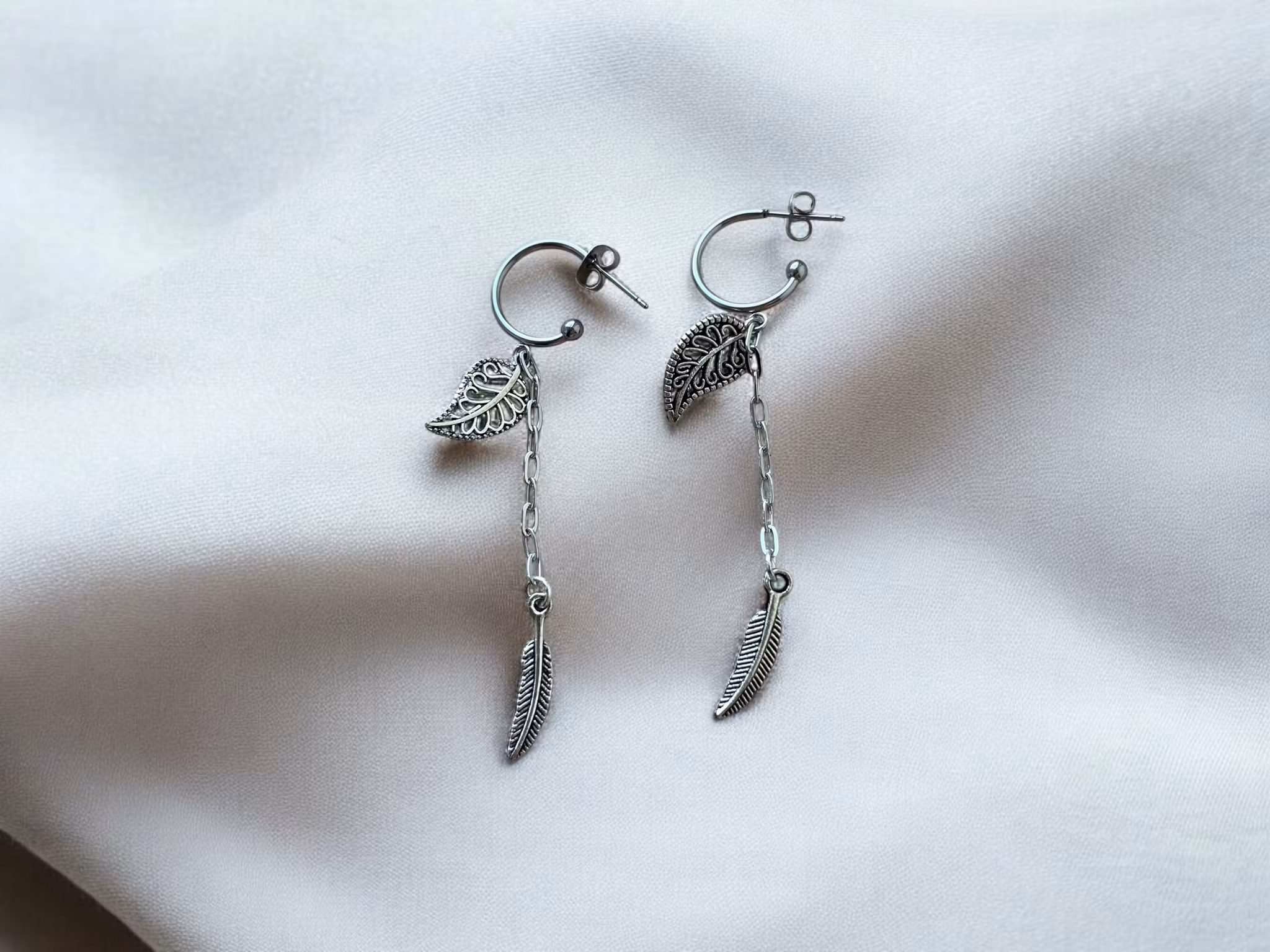 - Design: Hoop-øreringe med vedhæng i form af et detaljeret blad og en fin fjer.
