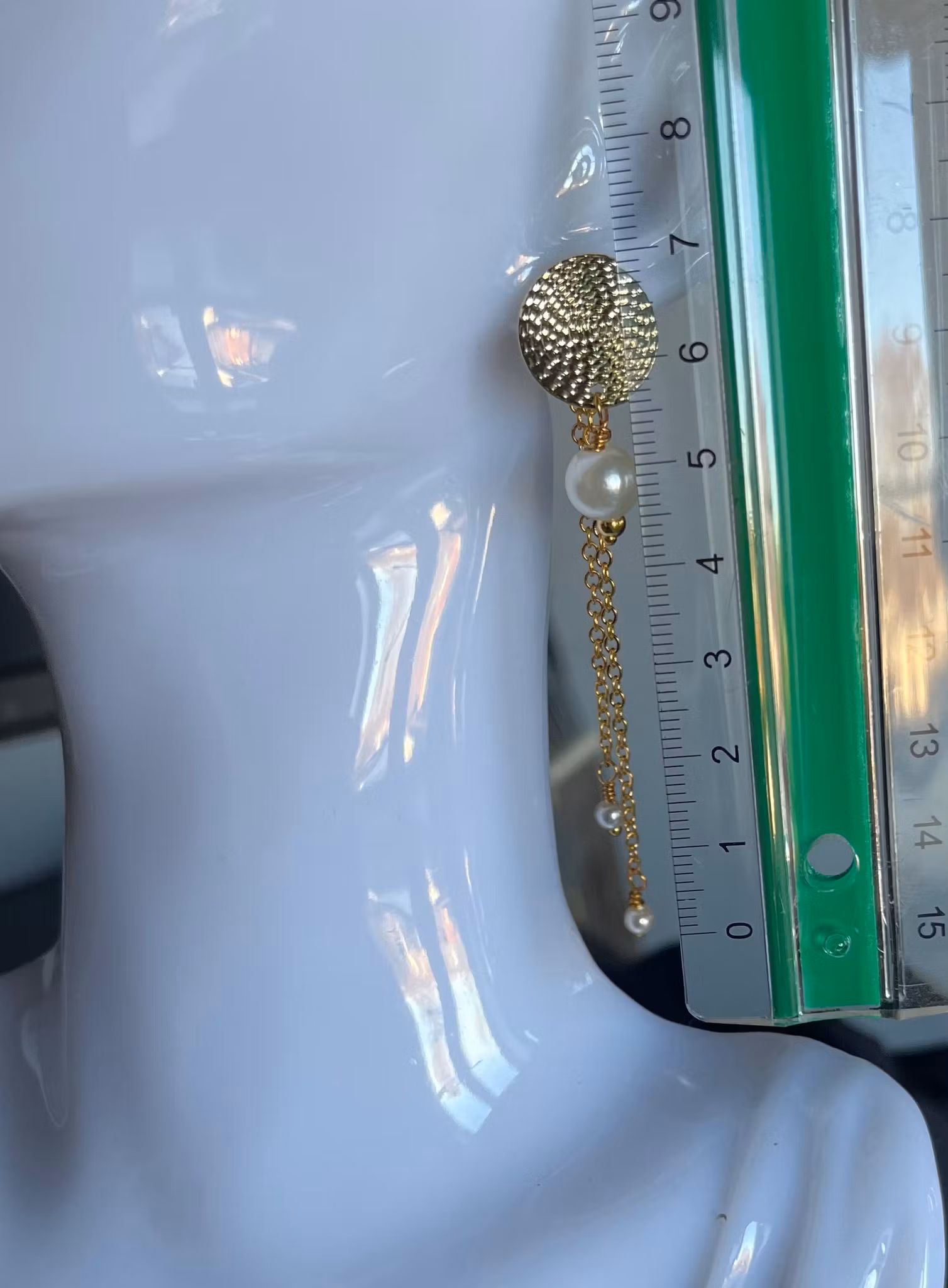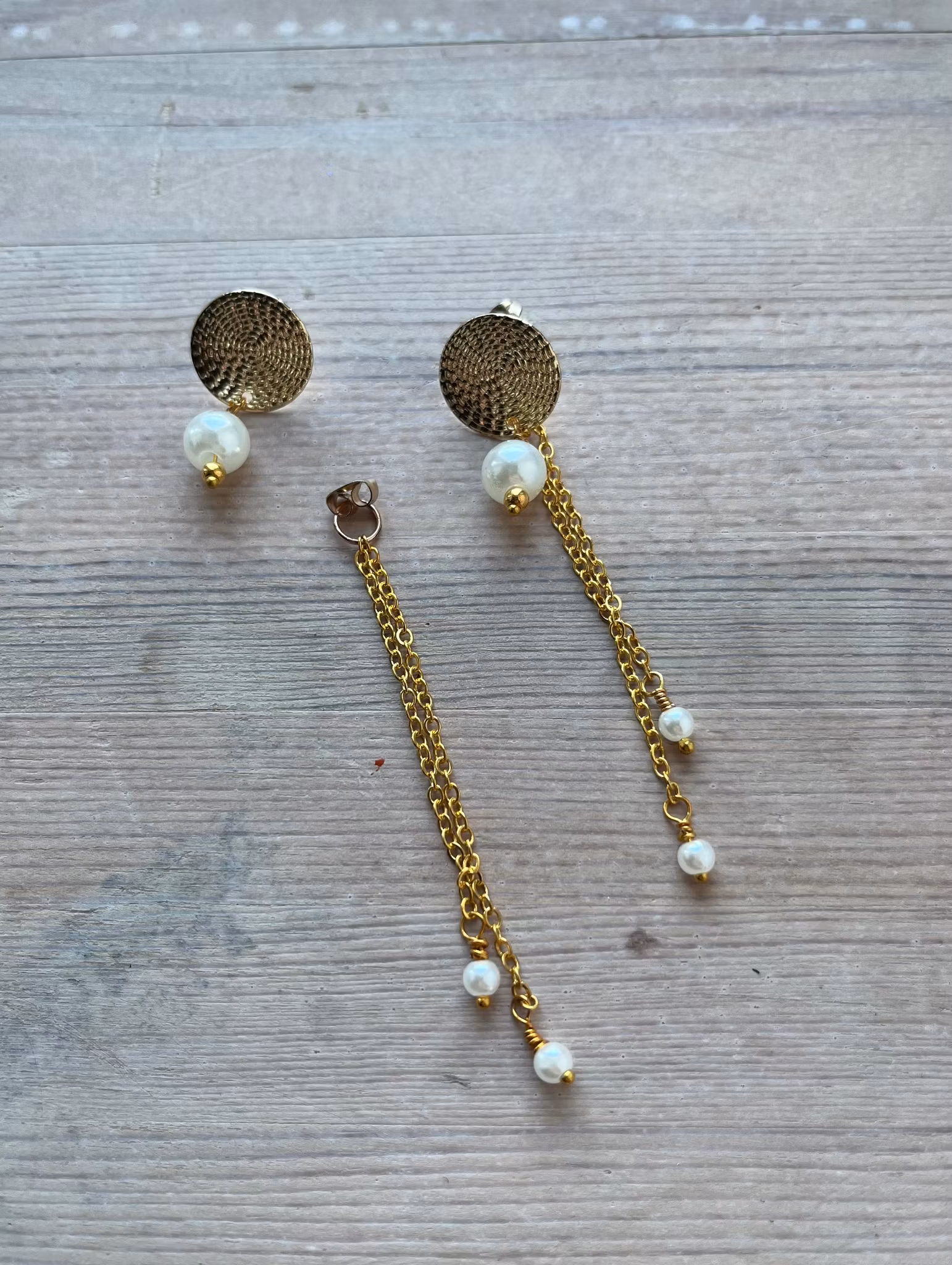 - Design: Runde guldplader med tekstur, hængende kæder med perler.