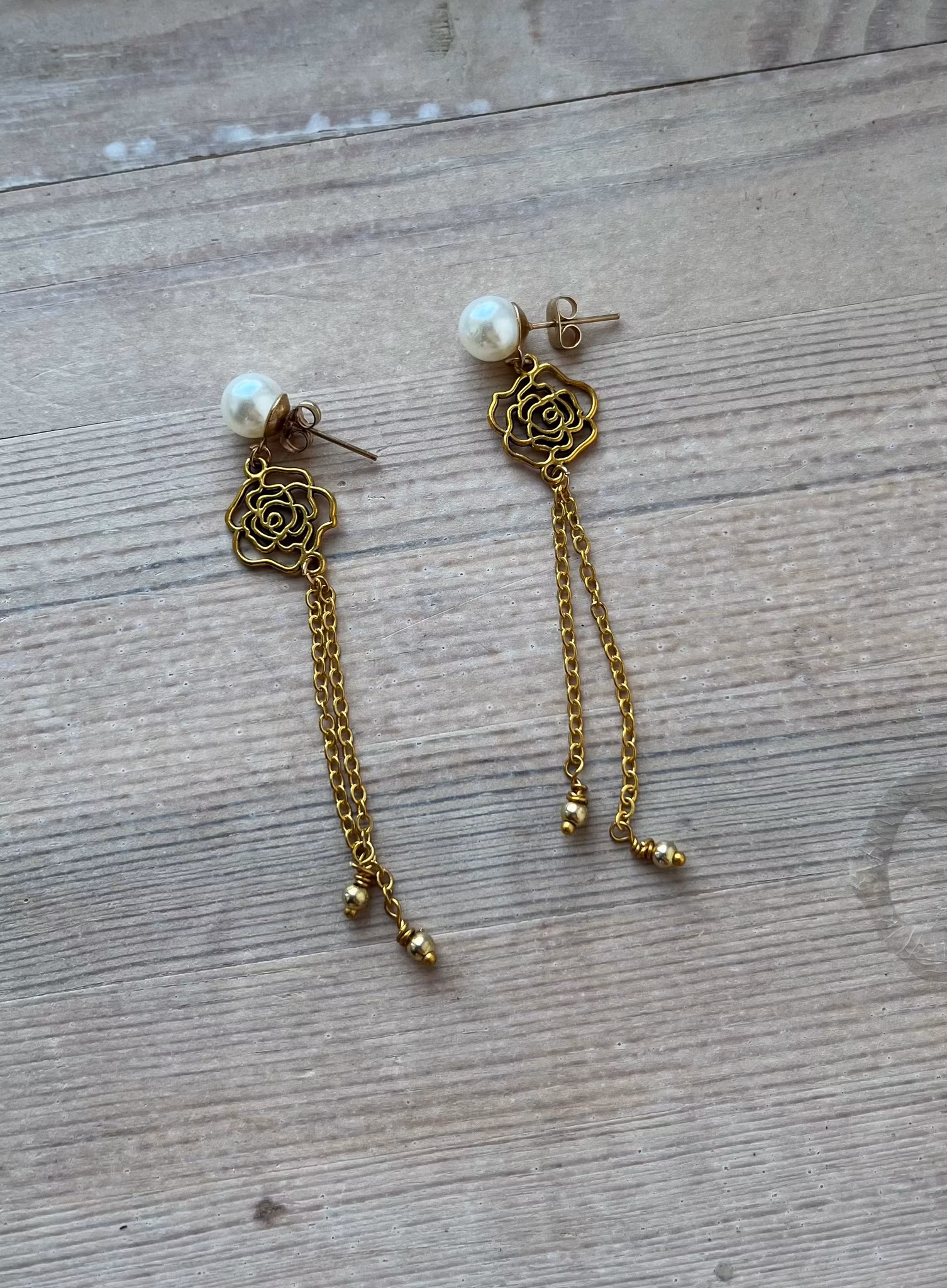 Fra rosen hænger to slanke kæder, der tilføjer bevægelse og elegance til øreringene, og som ender med små dekorative elementer.