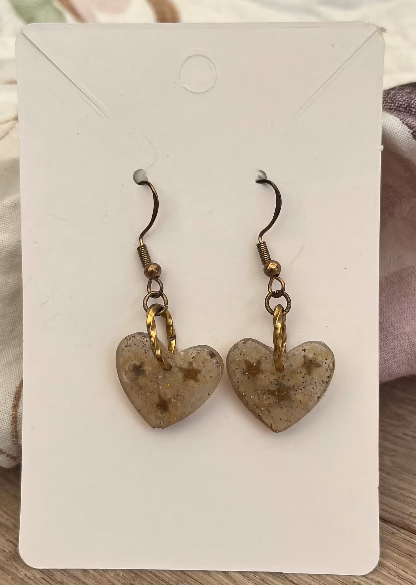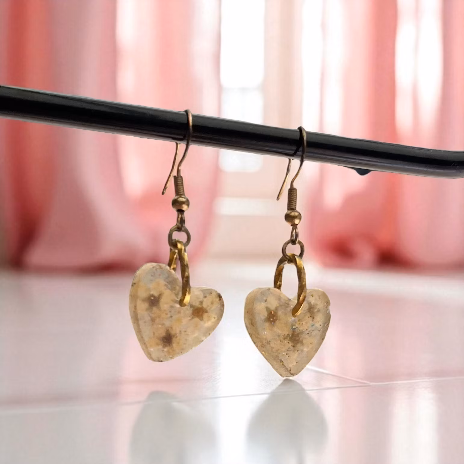 Disse charmerende hjerteformede øreringe er håndlavede i klar resin med smukt indkapslede, naturlige elementer, der giver et unikt og drømmende udtryk.De lette øreringe er monteret med klassiske guldfarvede ørekroge og en lille ring, der elegant forbinder hjertet med kroken. Perfekte til at tilføje et feminint og personligt touch til ethvert outfit