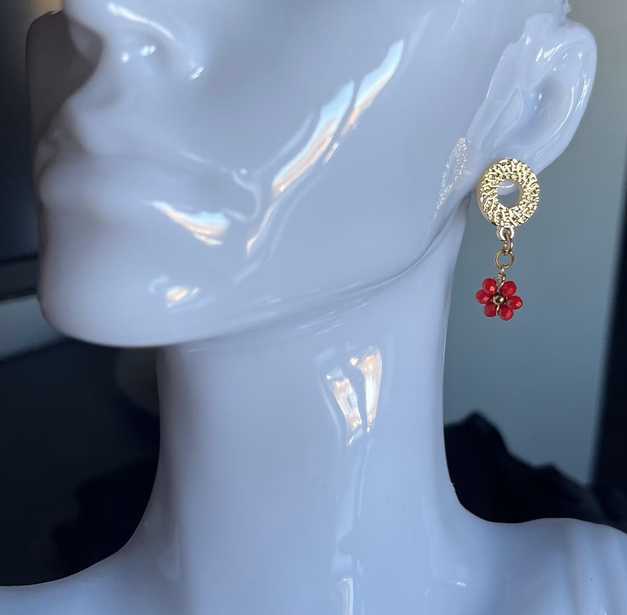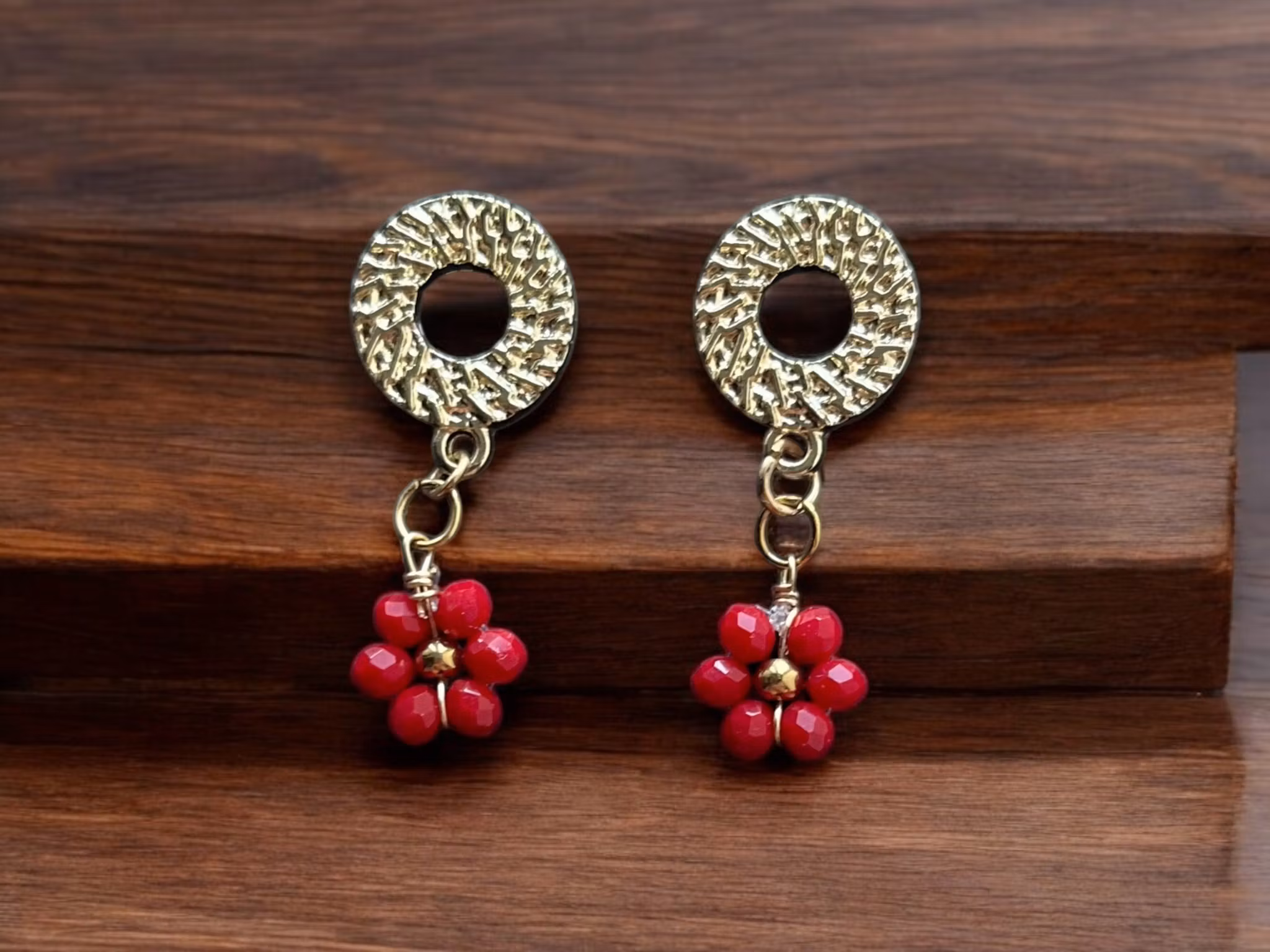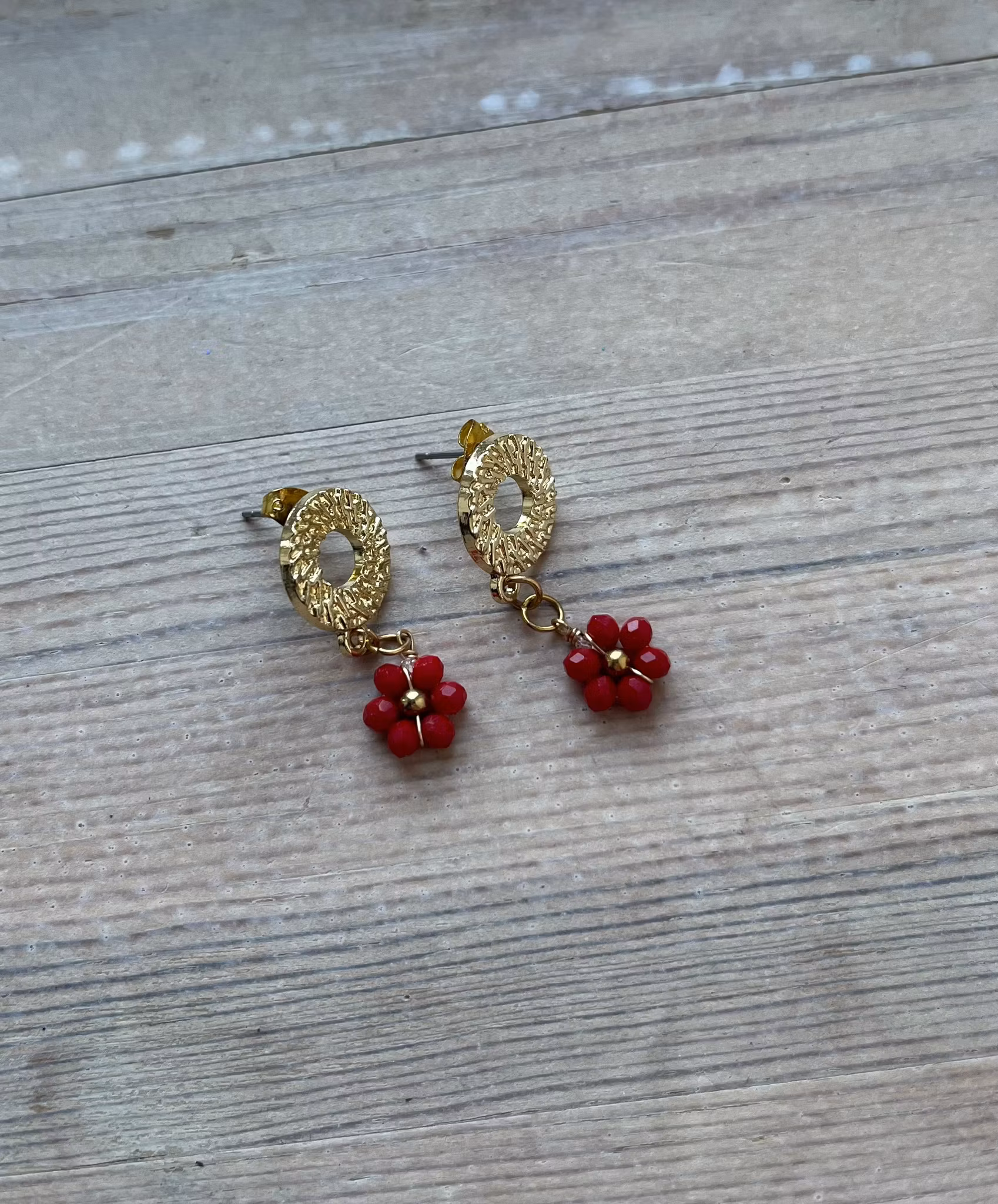 Disse unikke øreringe kombinerer et elegant design med iøjnefaldende detaljer. Øreringene har en smukt tekstureret, guldtonet cirkelformet top, der giver et raffineret udtryk. Fra den guldtonede cirkel hænger en charmerende blomsterformet vedhæng, udført med strålende røde krystaller, der fanger lyset smukt. En lille guldperle i midten af hver blomst tilføjer et delikat touch.
