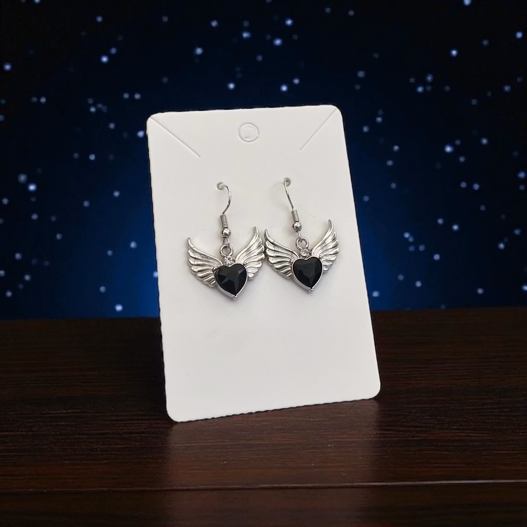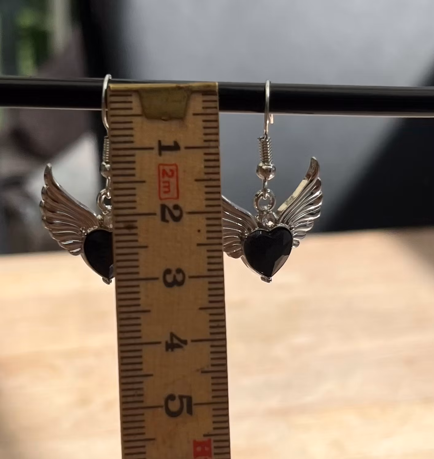 Disse smukke øreringe er designet med et elegant sølvfarvet metal, der rammer et dybsort hjerte ind, flankeret af detaljerede englevinger. Øreringene kombinerer et romantisk og symbolsk udtryk, der appellerer til dem, der søger et unikt smykke med personlighed. Englevingerne kan symbolisere frihed, beskyttelse eller åndelig forbindelse. Perfekte til at tilføje et strejf af mystik og elegance til ethvert outfit.