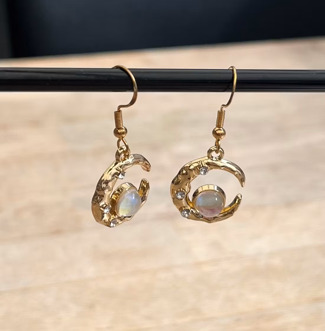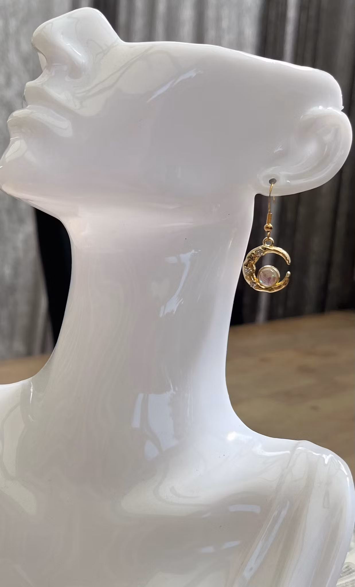 Disse fortryllende "Måneskinsdrømme" øreringe fanger essensen af nattens magi. De smukt udformede halvmåner, med deres teksturerede overflade, omfavner en iriserende perle, der minder om månens blide skær. De er perfekte til at tilføje et strejf af mystik og elegance til ethvert outfit, uanset om det er til hverdag eller fest.