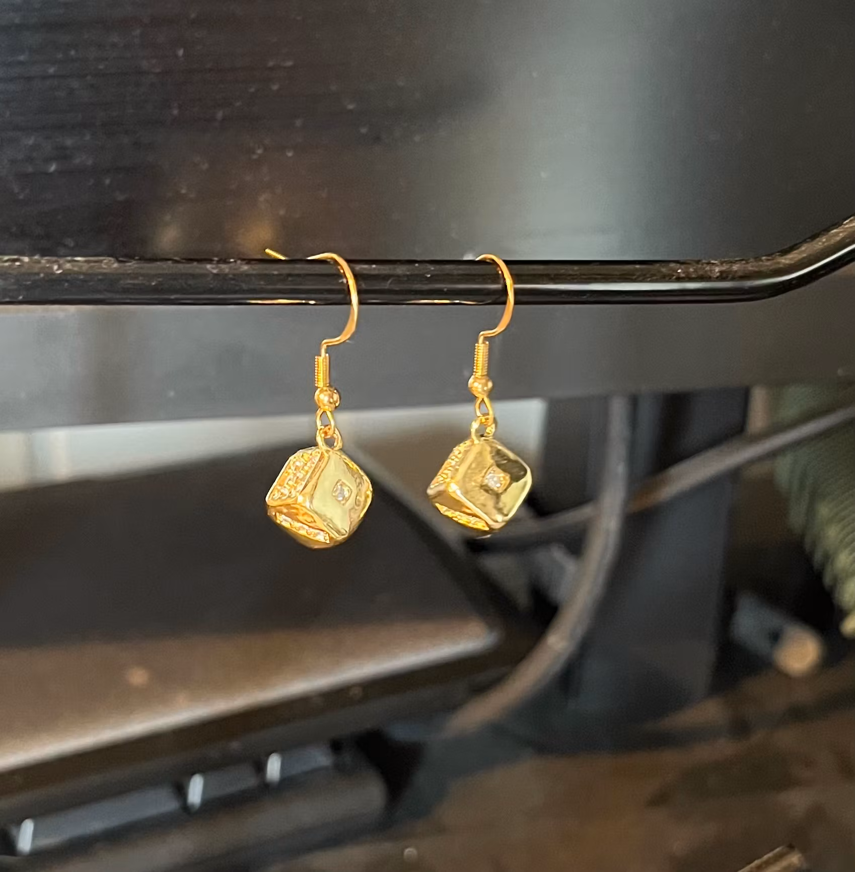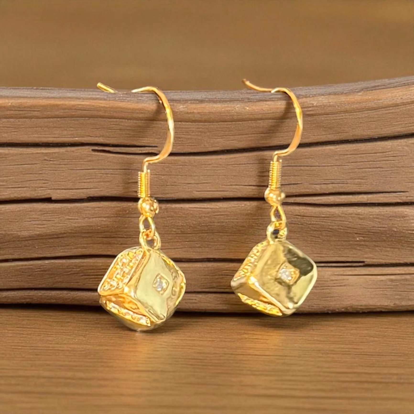 Disse unikke øreringe kombinerer et legende design med tidløs elegance. De er formet som små, polerede terninger og tilfører et strejf af personlighed til ethvert outfit. Hver terning er prydet med indfattede, skinnende sten, der fanger lyset og giver en diskret, men iøjnefaldende glans.