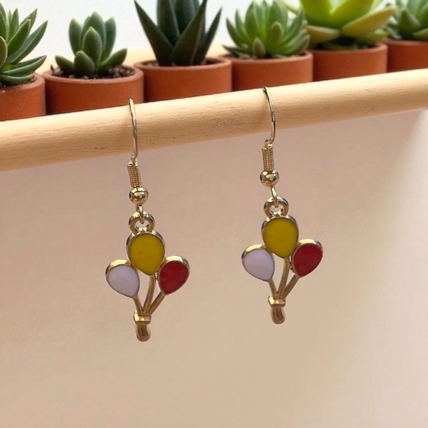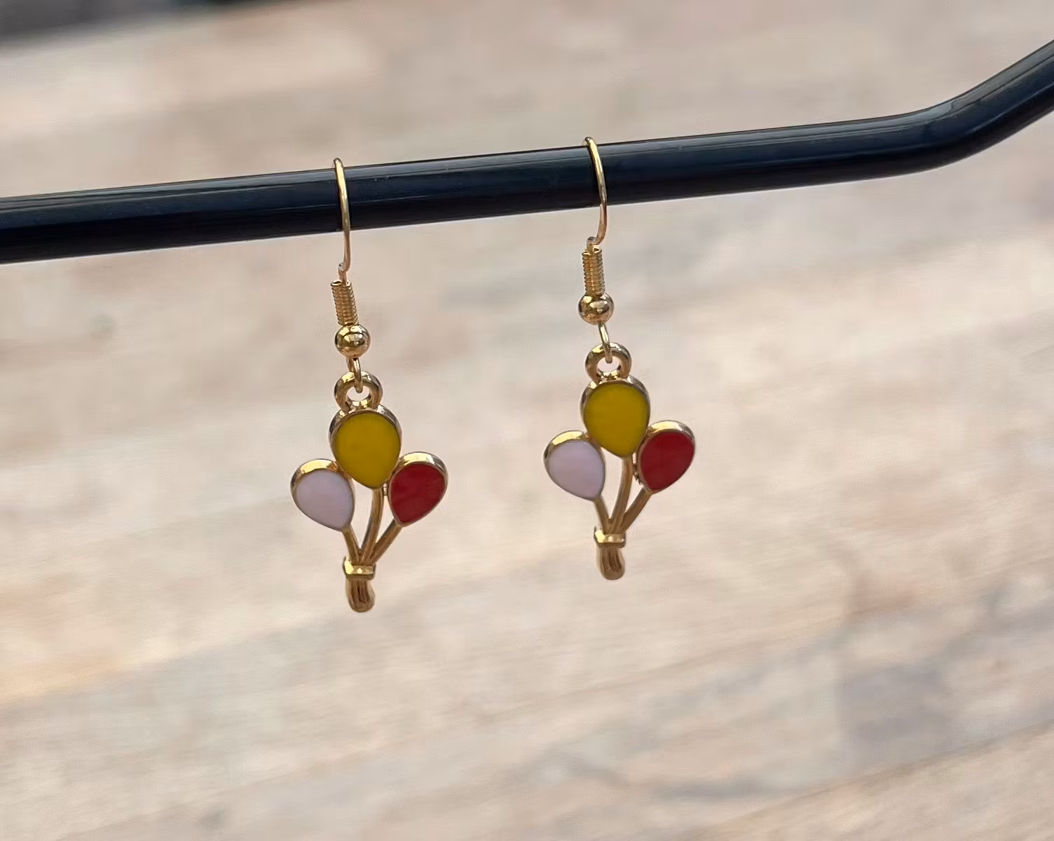Disse charmerende øreringe er en festlig tilføjelse til ethvert outfit, der ønsker et strejf af glæde og farve. Med deres legesyge design af balloner i livlige farver som gul, hvid/lysrosa og rød, er de perfekte til at fejre særlige lejligheder eller blot sprede godt humør i hverdagen. De lette materialer sikrer komfort hele dagen, mens det gyldne finish tilføjer et elegant touch. Ideelle som gave eller til at forkæle dig selv med et unikt og iøjnefaldende smykke.