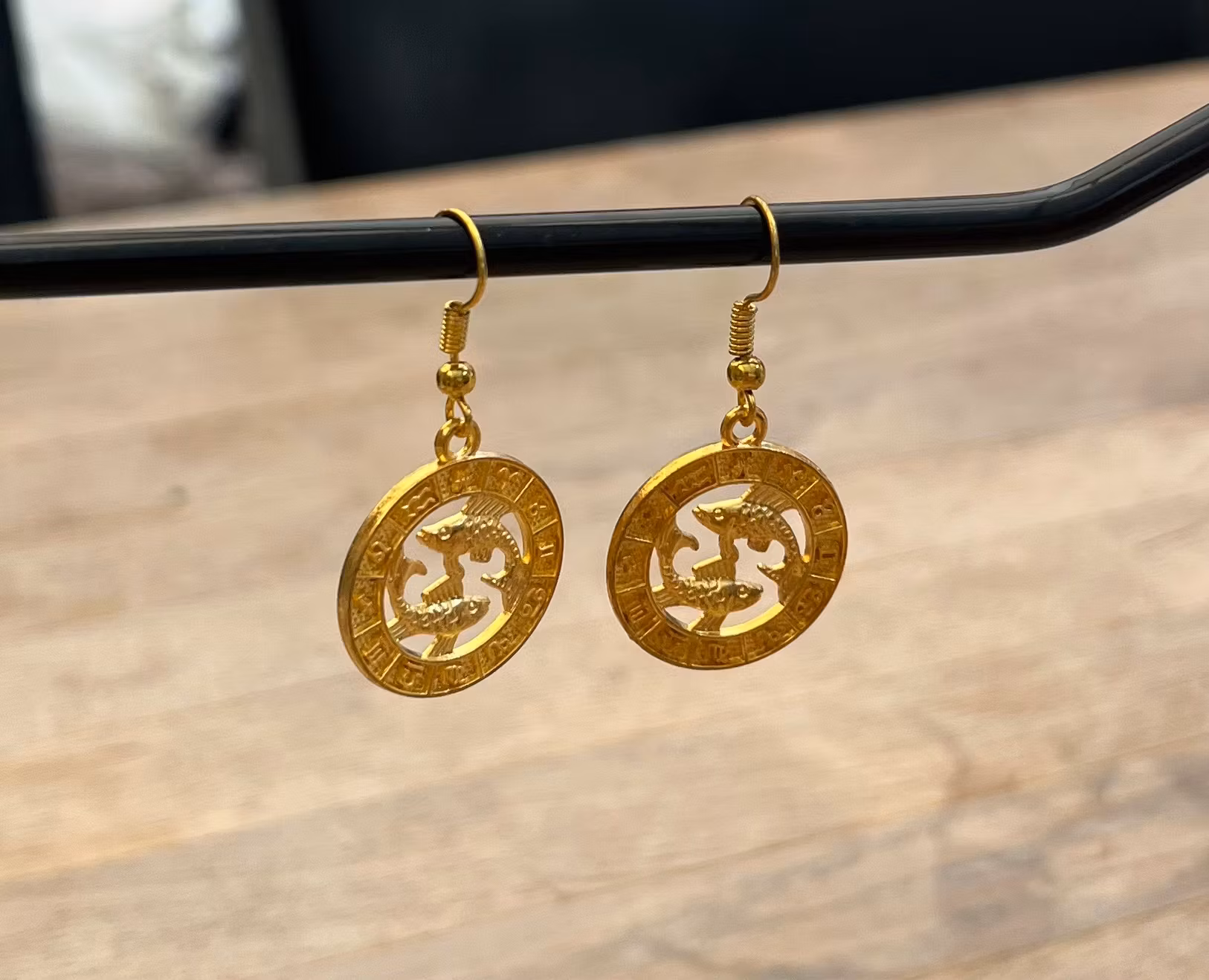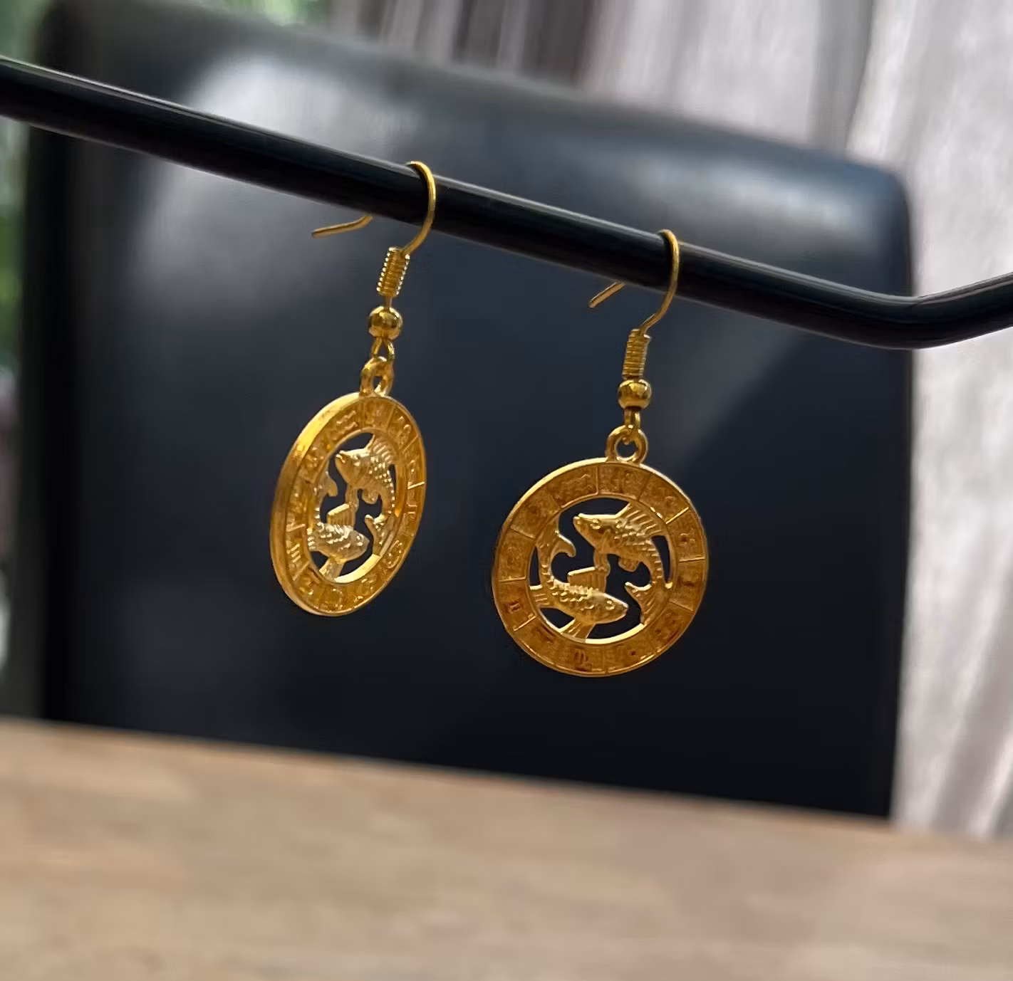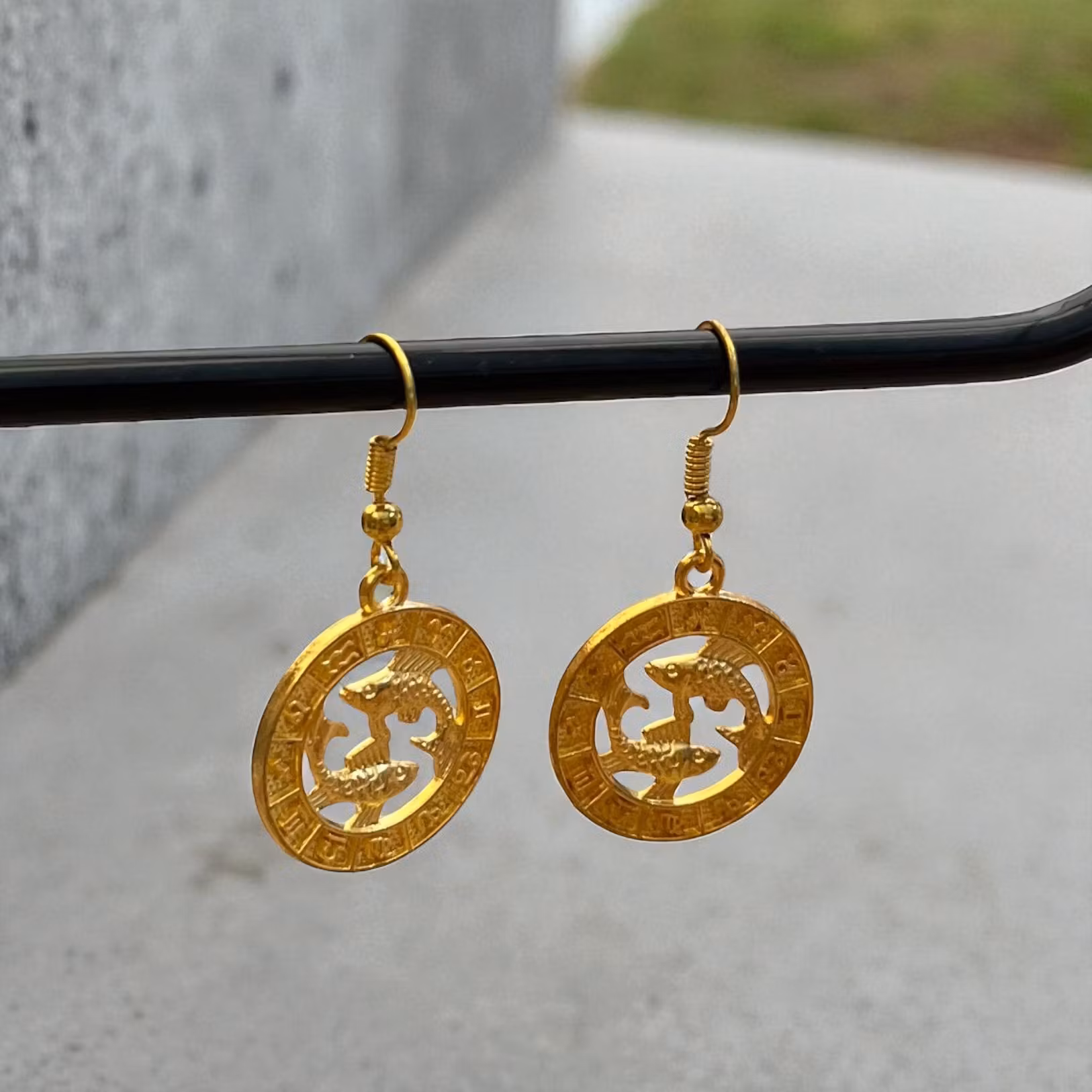 Oplev elegance med disse smukke øreringe, der hylder Fiskens stjernetegn. Hver ørering er et kunstværk i guldfarvet metal, prydet med det ikoniske Fisk-symbol i en detaljeret, udskåret cirkel. Perfekte til at udtrykke din personlige stil eller som en meningsfuld gave til en Fisker i dit liv. De lette dingle-øreringe er komfortable at bære hele dagen og tilføjer et strejf af himmelsk charme til ethvert outfit