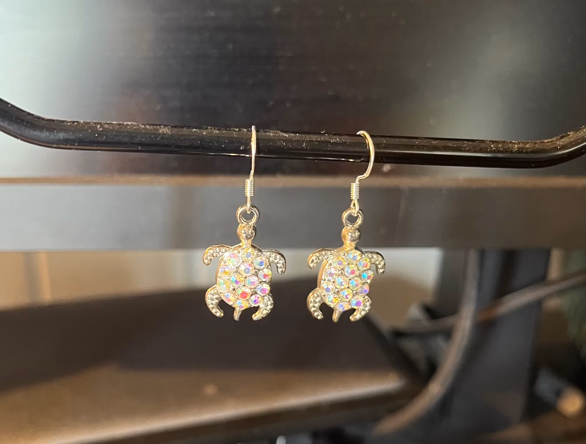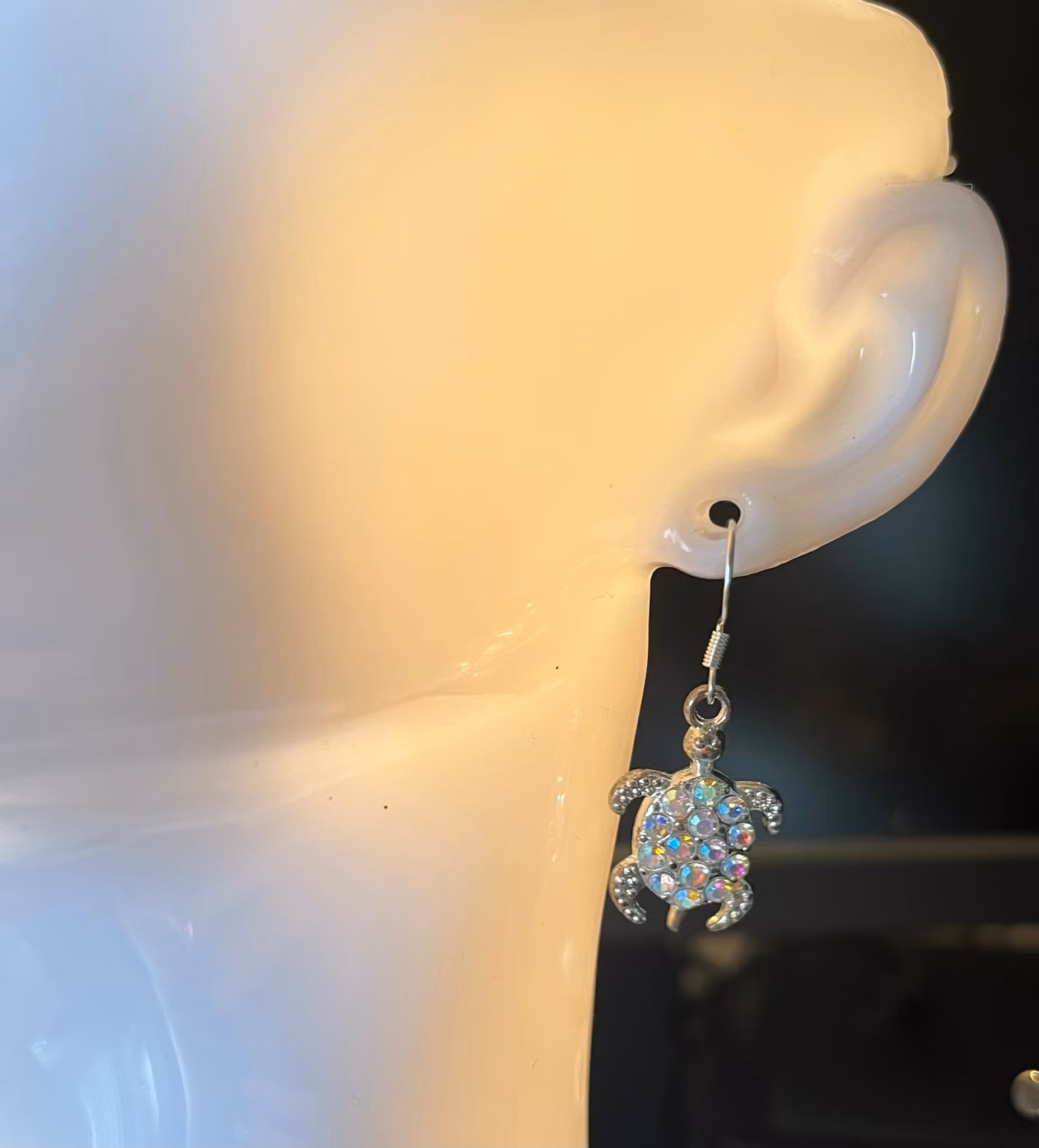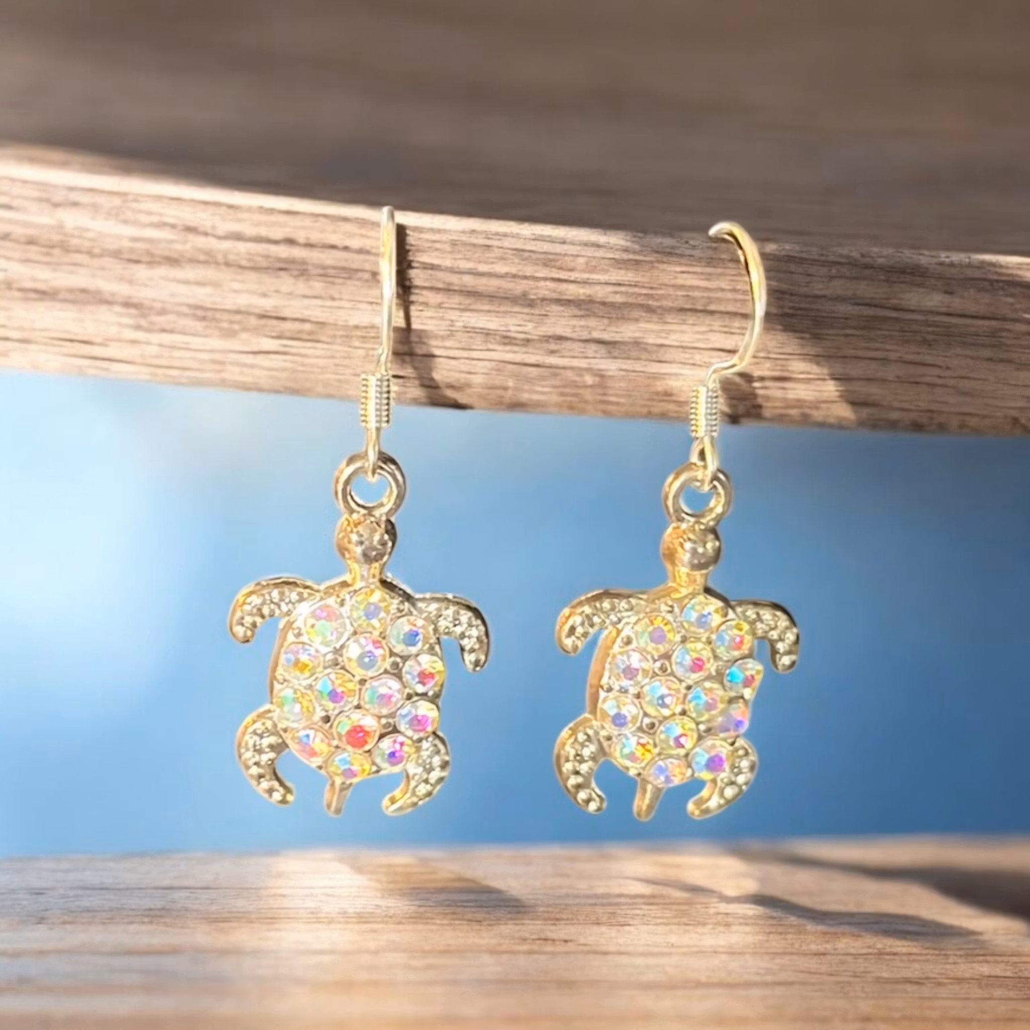 Disse smukke øreringe er formet som havskildpadder og prydet med funklende sten, der reflekterer lyset i skiftende nuancer, ligesom opal. Havskildpadder symboliserer et langt liv og lykke i mange kulturer, især på Hawaii.