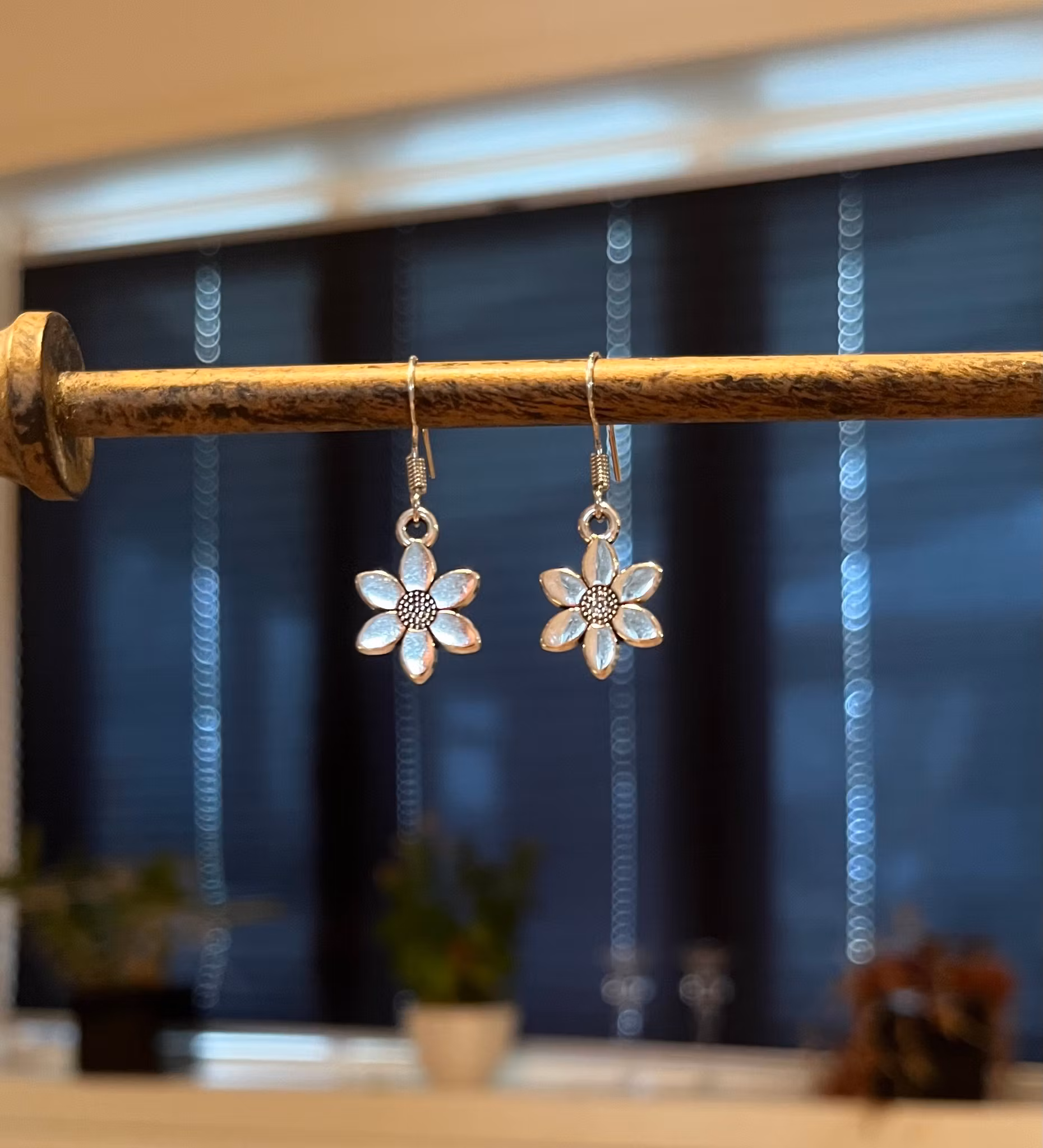 Sølvblomst - ca. 3 cm 25,- Øreringe med Blomster i sølvfarve og kroge af Sterling silver / sølv. På lager Tilføj til kurv Lagersaldo: 1 Del Information Anmeldelser Øreringe med Blomster i sølvfarve og kroge af Sterling silver / sølv.