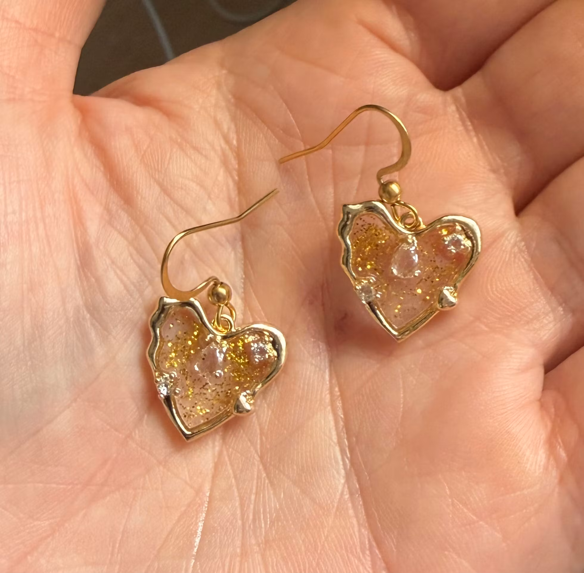 - Vedhæng: Hjerteformet ramme med resin-fyld, krystaller og guldflager.