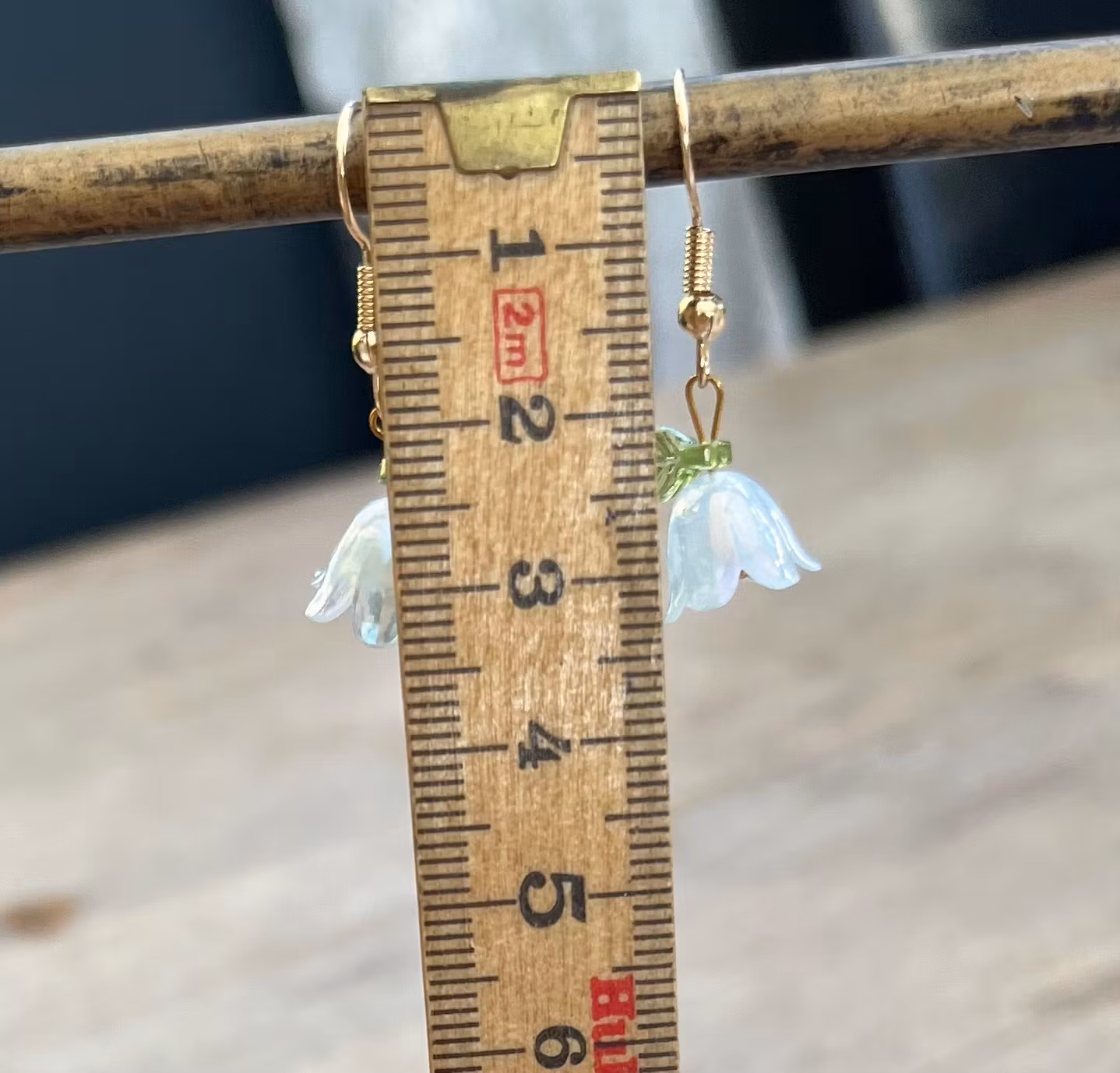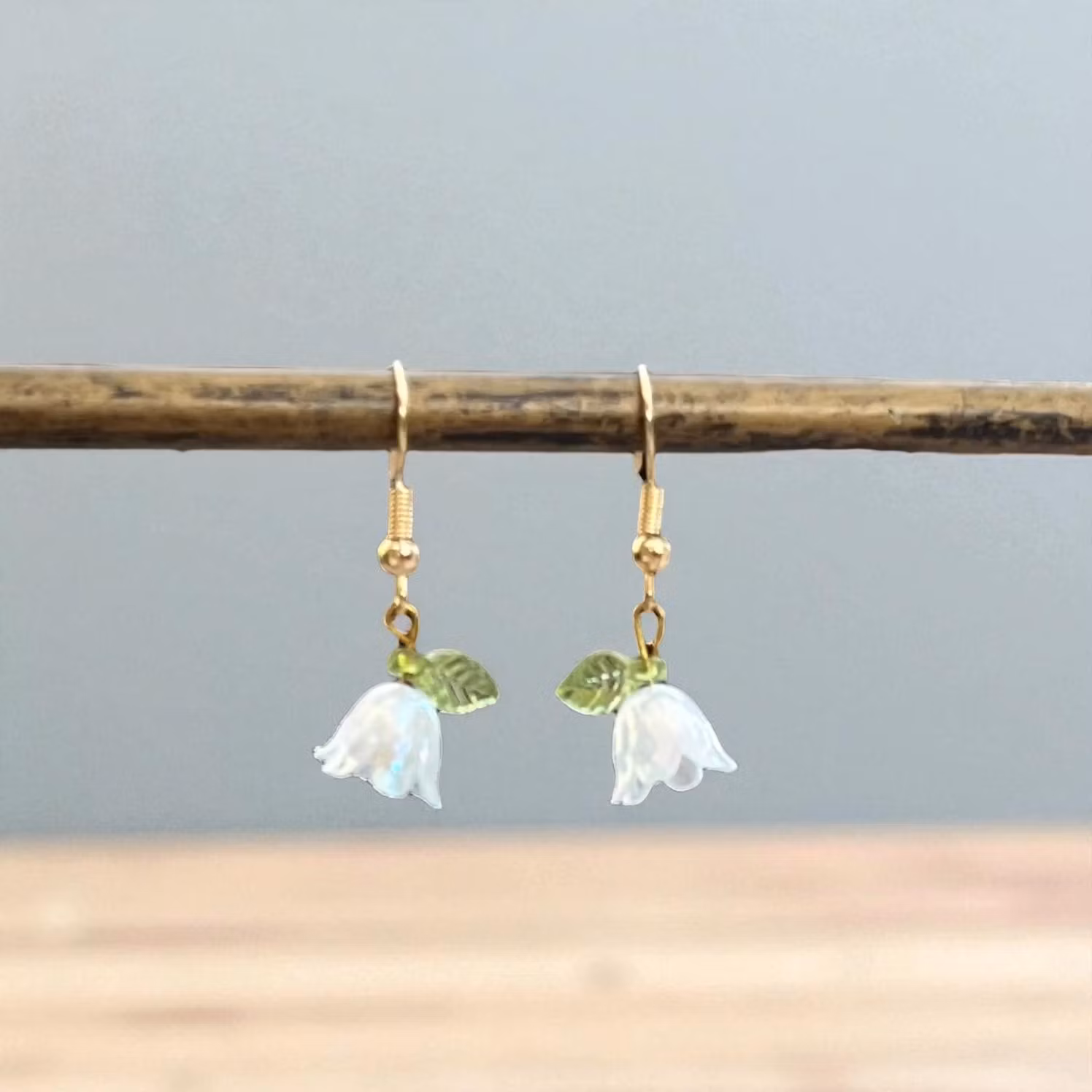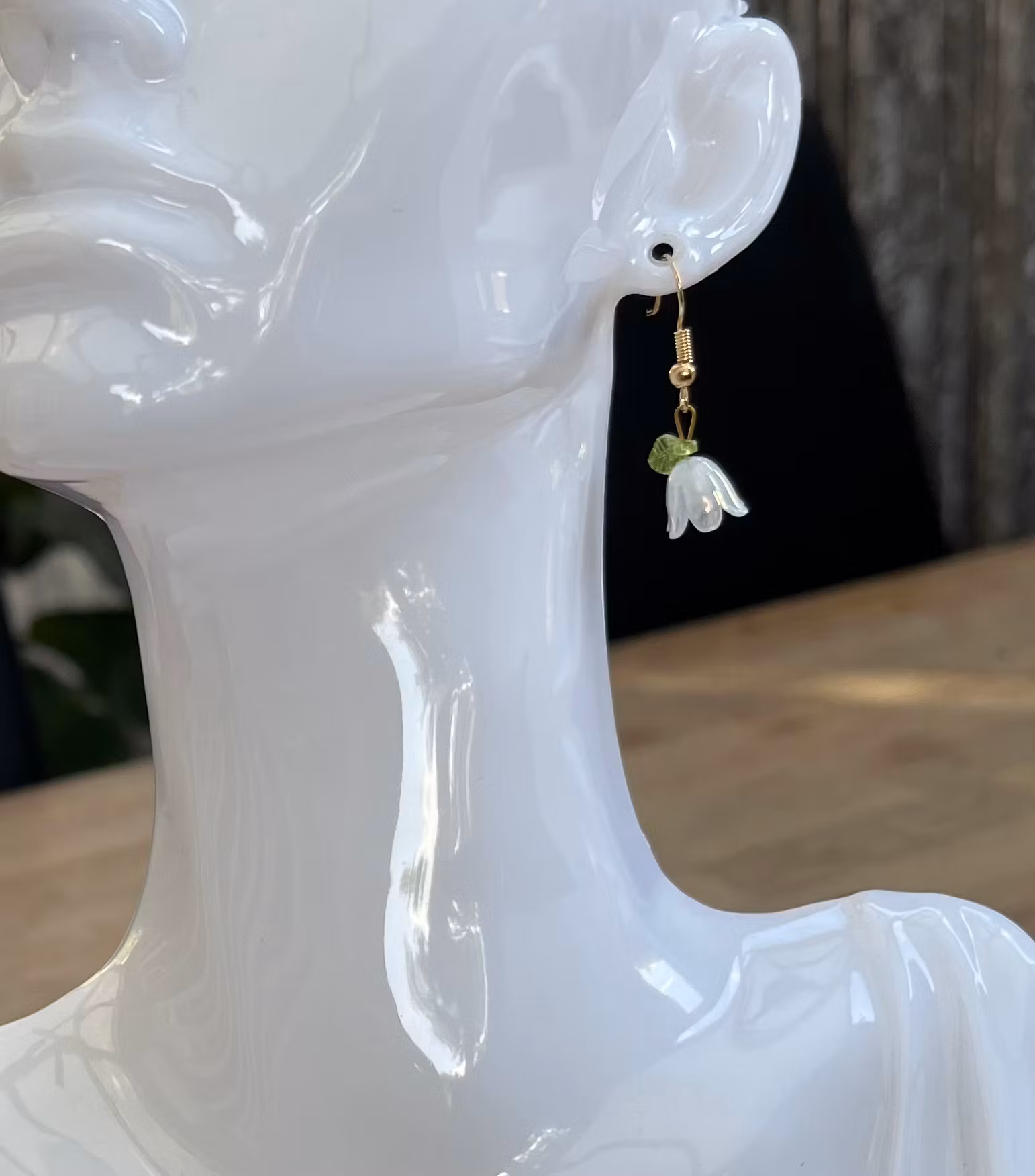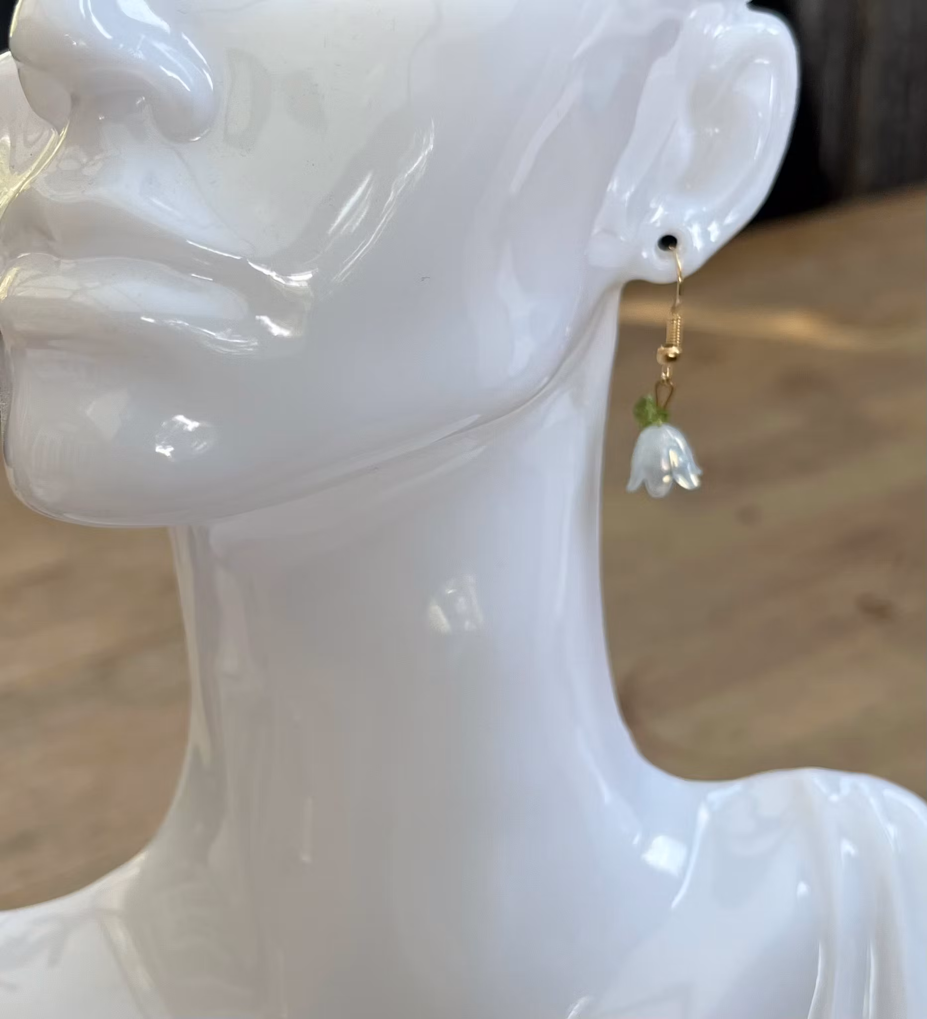 Disse smukke øreringe er inspireret af den yndige liljekonval, der symboliserer renhed og lykke. Hver ørering har en detaljeret, klokkeformet blomst i mælkehvidt glas eller akryl, der er prydet med en lille perle i midten. De grønne blade, der er fastgjort over blomsten, tilføjer et friskt og naturligt touch. Øreringene er monteret på elegante, guldfarvede kroge, der sikrer en behagelig pasform.