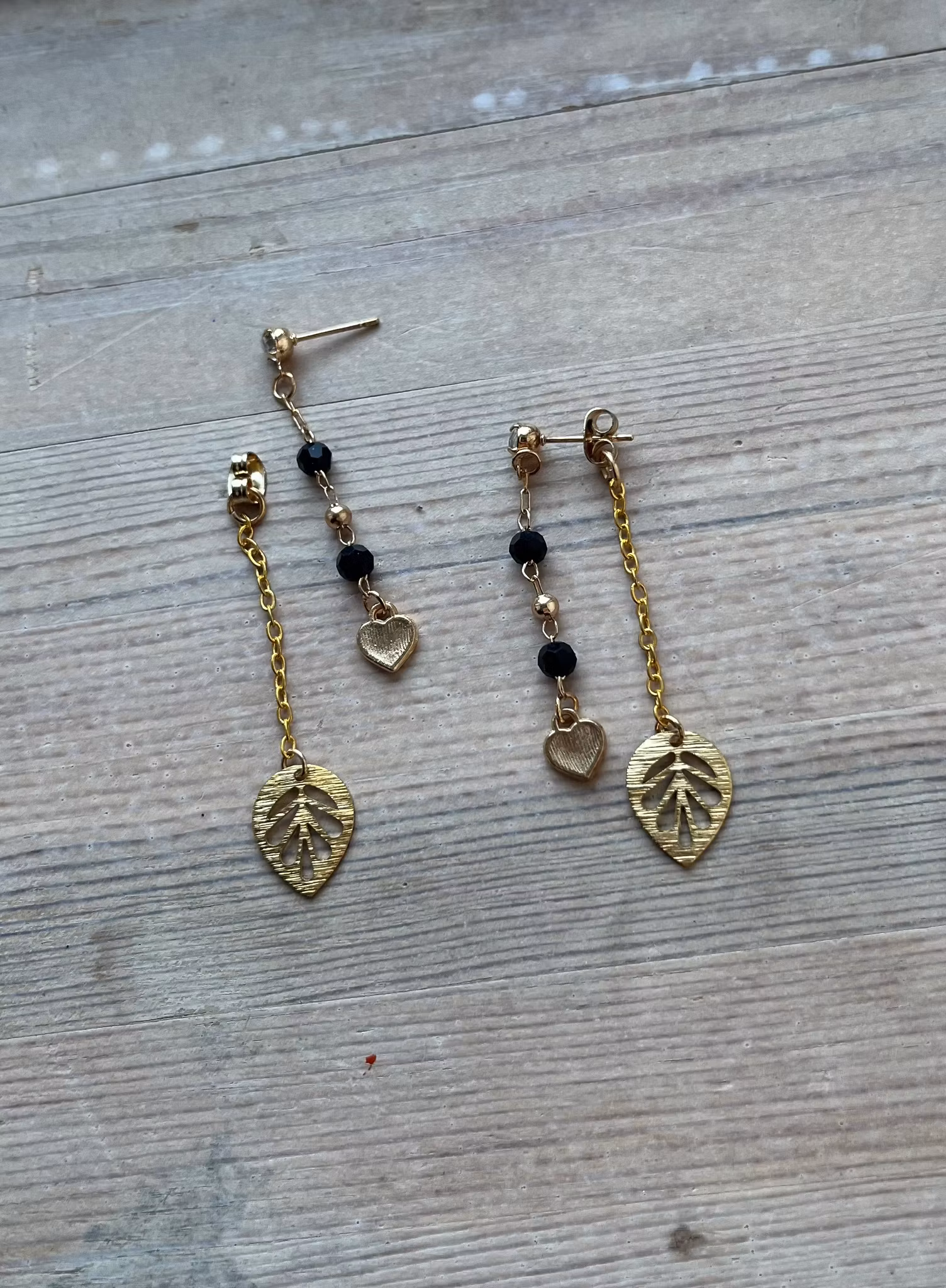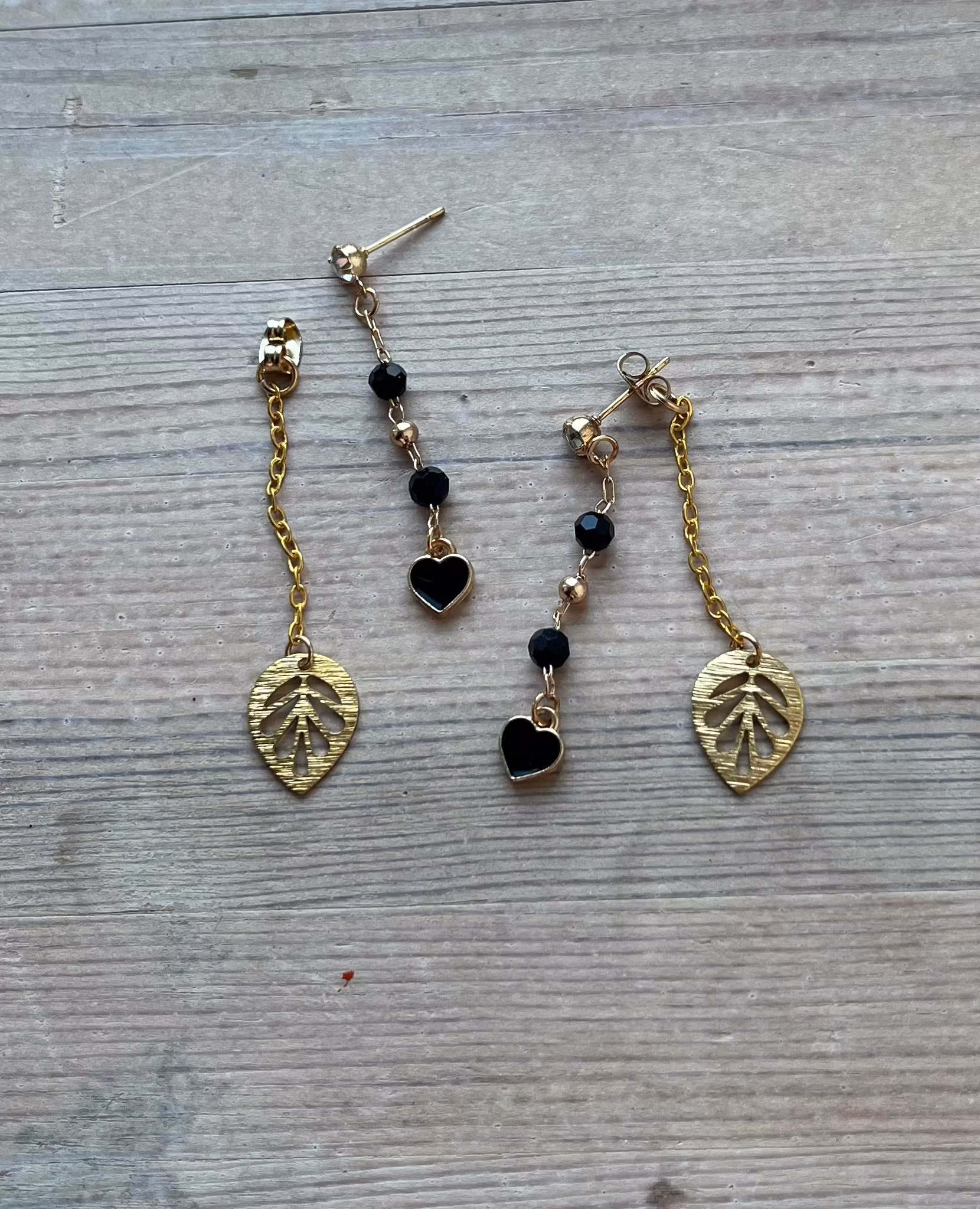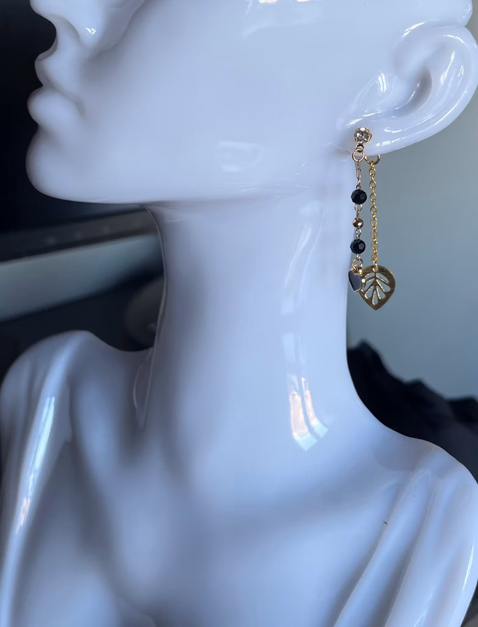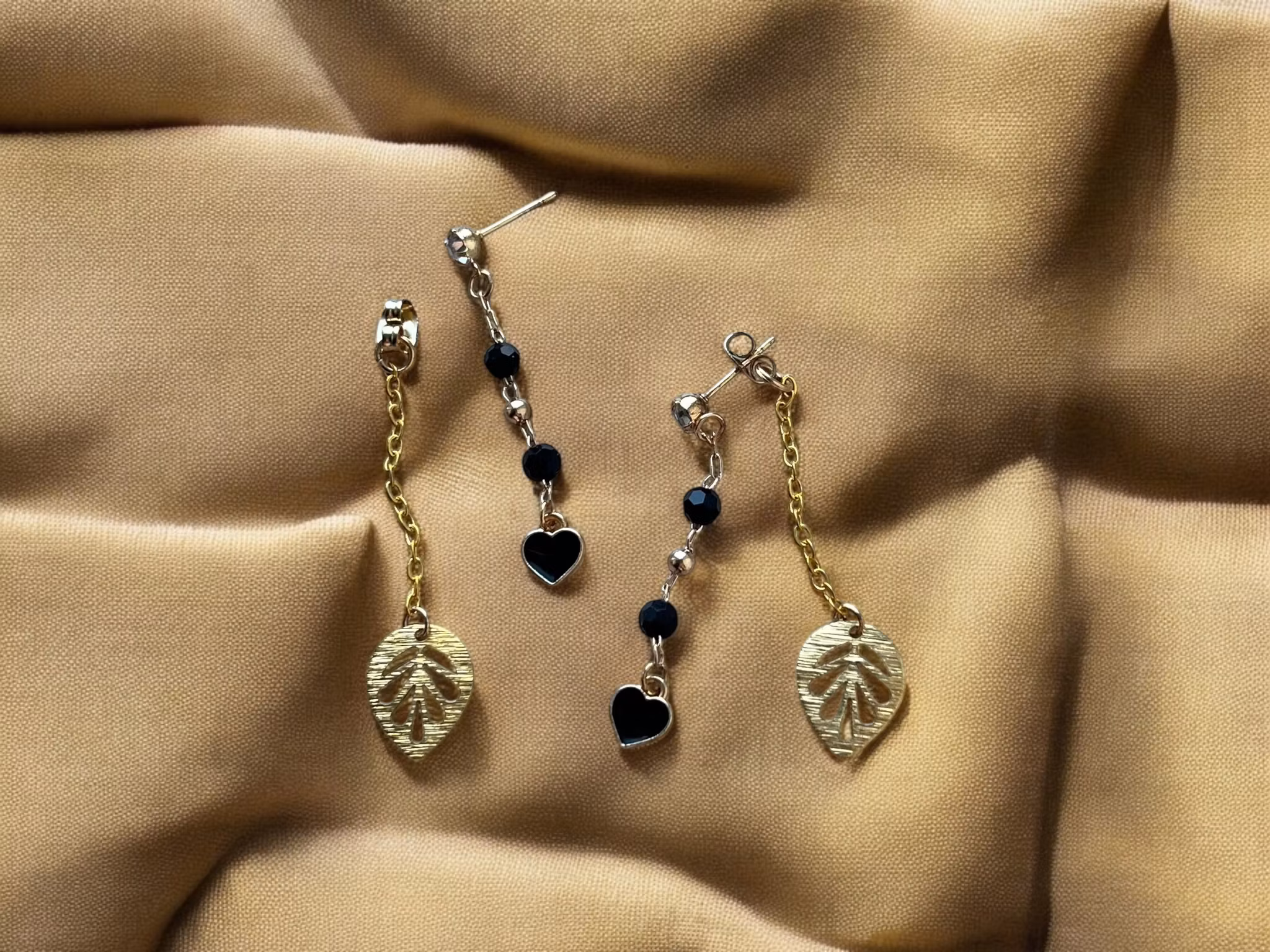Disse elegante øreringe kombinerer gyldne bladdetaljer med sorte hjertevedhæng og glitrende sorte perler. De lange, slanke designs giver et sofistikeret udtryk, perfekt til både hverdagsbrug og særlige lejligheder. En tidløs tilføjelse til enhver smykkesamling.