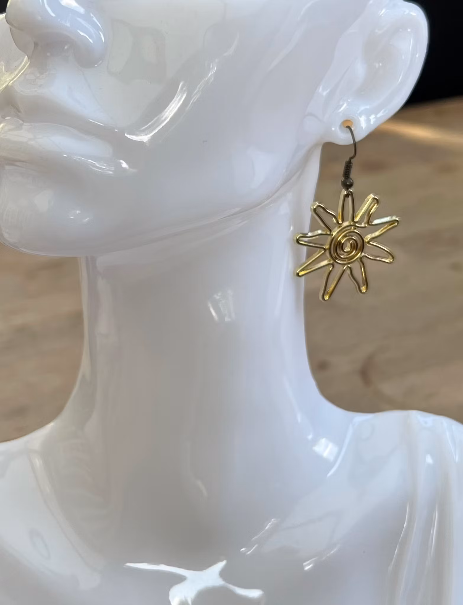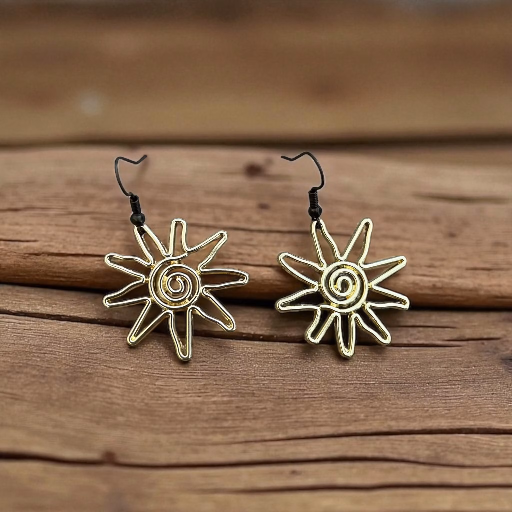 Disse elegante øreringe har et feminint og boheme-inspireret design, der fanger solens gyldne stråler. De er formet som en stiliseret sol med en spiral i midten og er perfekte til at tilføje et lyst og optimistisk udtryk til ethvert outfit. Øreringene er lette og behagelige at have på, hvilket gør dem ideelle til både hverdagsbrug og særlige lejligheder