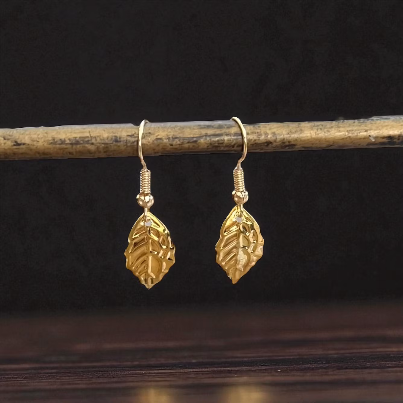 Disse smukke øreringe er formet som detaljerede blade, der giver et elegant og naturinspireret udtryk. Øreringene er guldfarvede og har en fin, tekstureret overflade, som fremhæver bladenes naturlige årer. De er monteret på klassiske ørekroge, der sikrer en behagelig pasform.