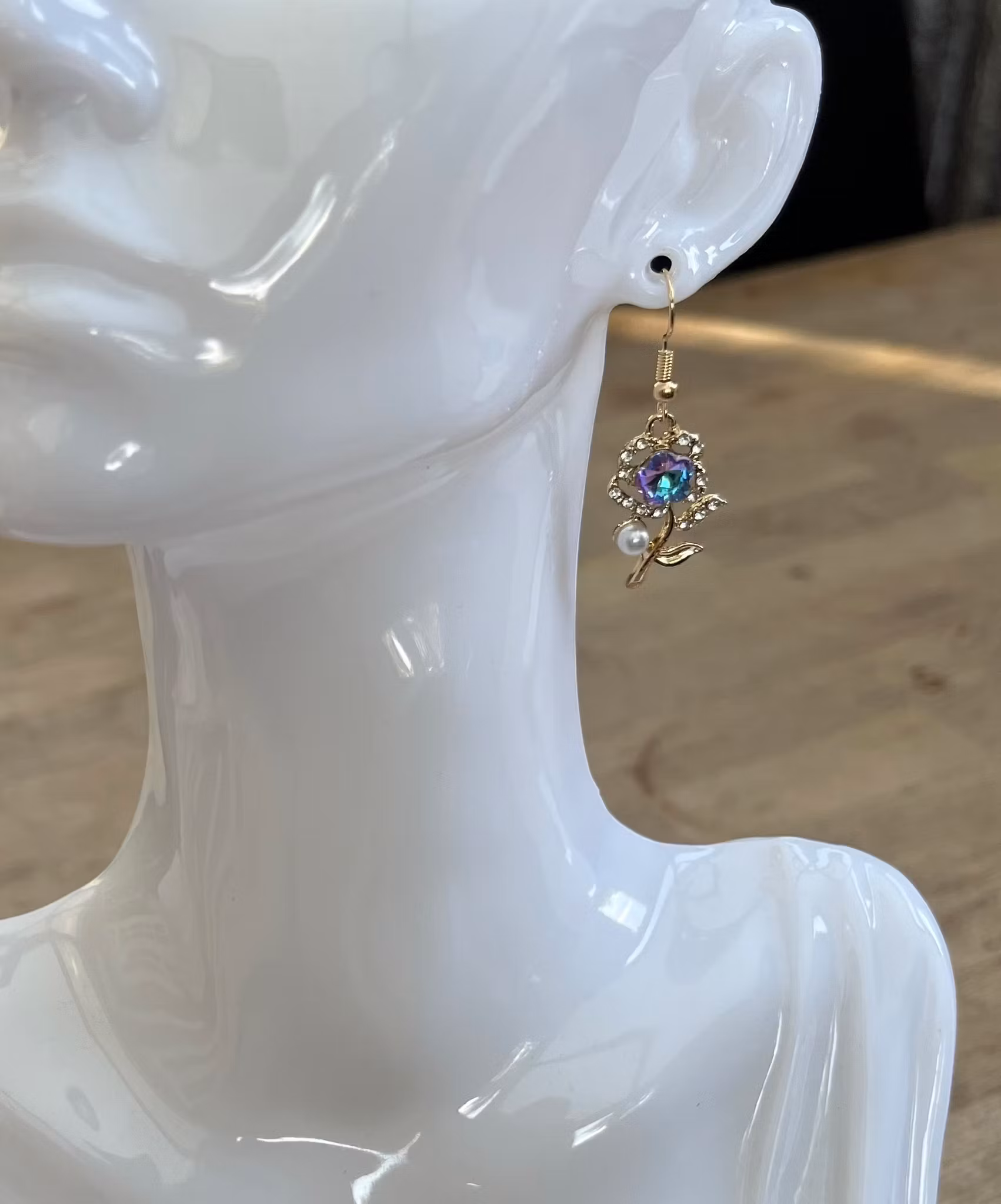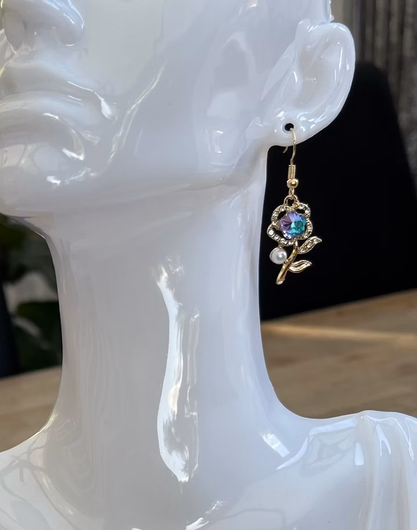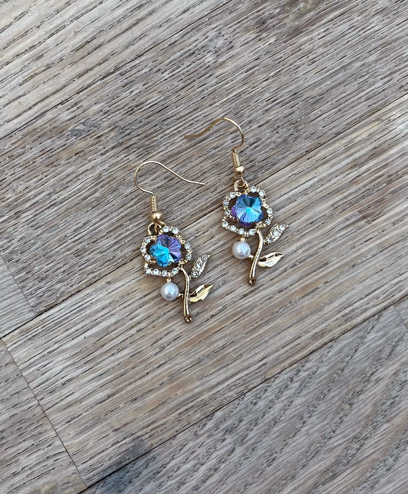 Disse fortryllende øreringe er designet som fine blomster, der fanger lyset og skaber et magisk skær. Hver ørering har en iriserende krystal i midten, som skifter farve i nuancer af lilla, blå og grøn. Blomstens kronblade er elegant omkranset af funklende, små krystaller, der tilføjer et strejf af glamour. Nederst hænger en lille, delikat perle, der fuldender det feminine og tidløse design. Øreringene er fremstillet i en gylden tone og er perfekte til at tilføje et smukt og unikt touch til ethvert outfit.