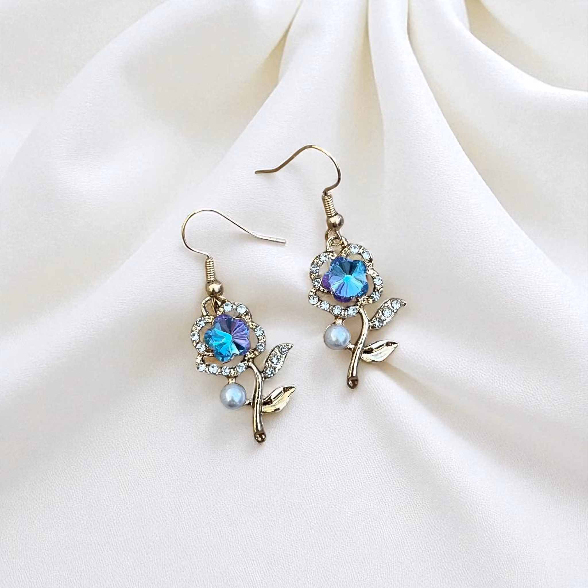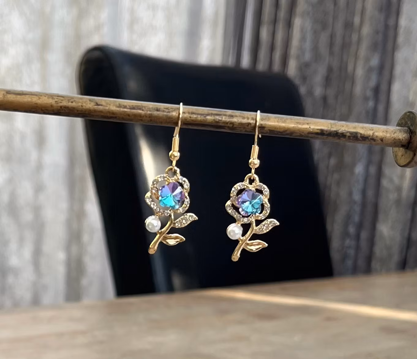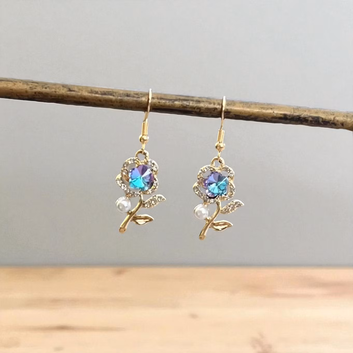 Disse fortryllende øreringe er designet som fine blomster, der fanger lyset og skaber et magisk skær. Hver ørering har en iriserende krystal i midten, som skifter farve i nuancer af lilla, blå og grøn. Blomstens kronblade er elegant omkranset af funklende, små krystaller, der tilføjer et strejf af glamour. Nederst hænger en lille, delikat perle, der fuldender det feminine og tidløse design. Øreringene er fremstillet i en gylden tone og er perfekte til at tilføje et smukt og unikt touch til ethvert outfit.