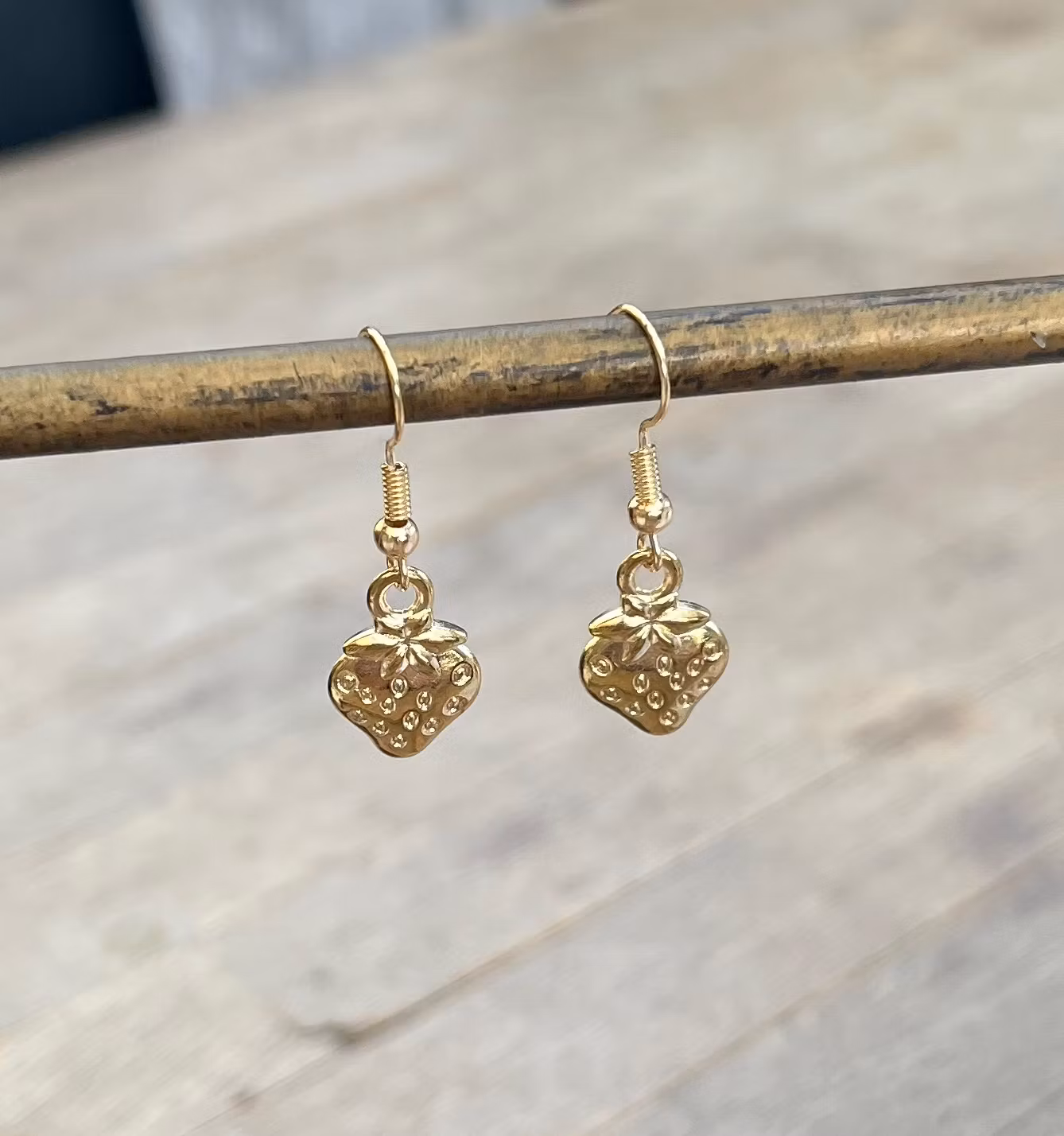 Disse charmerende øreringe har et detaljeret jordbærvedhæng i en skinnende guldfarve.De er lette og behagelige at bære, og det søde design tilføjer et legende touch til ethvert outfit.