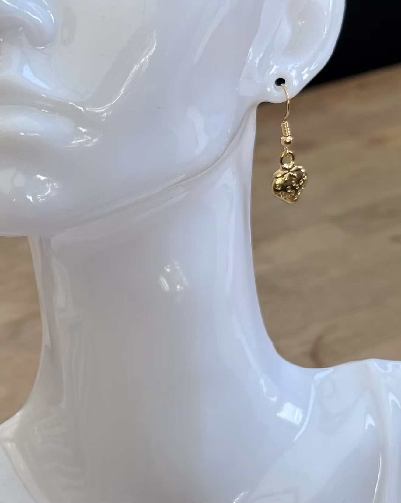 Disse charmerende øreringe har et detaljeret jordbærvedhæng i en skinnende guldfarve. De er lette og behagelige at bære, og det søde design tilføjer et leg