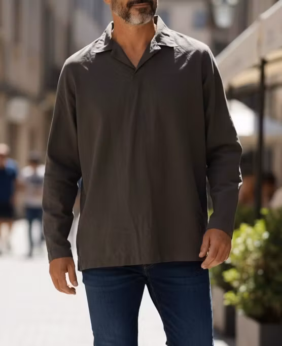 - Krave: En bred, spids krave, der overgår i en dyb V-udskæring uden knapper, hvilket skaber et rent og ubesværet look.