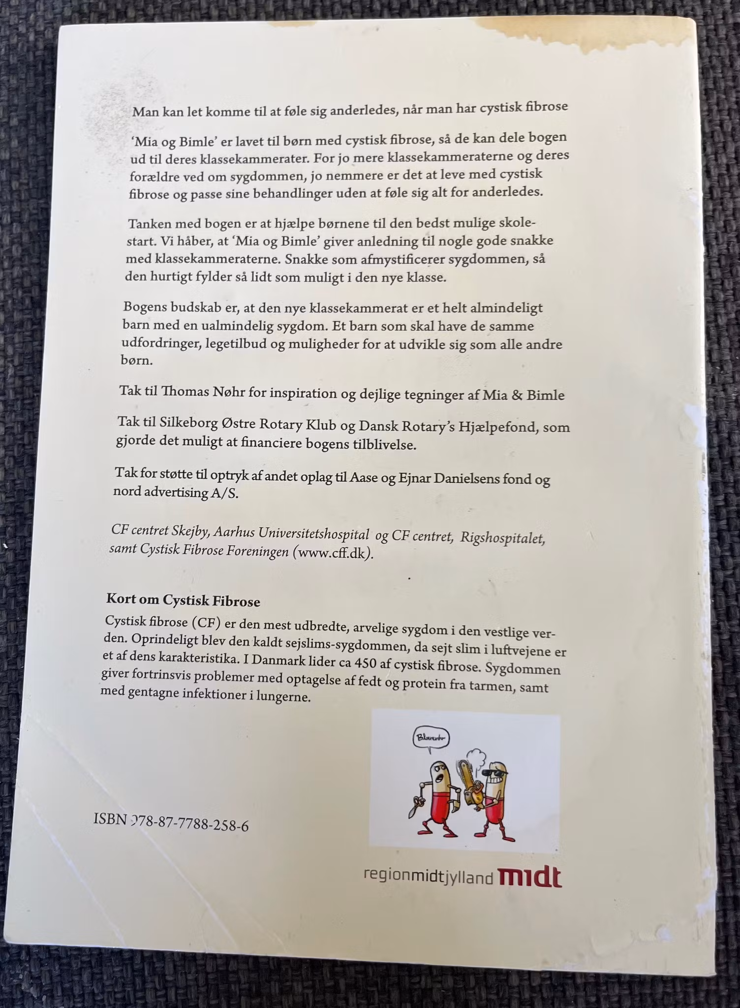 Bogen "Mia & Bimle: Noget om Cystisk Fibrose" er en publikation, der er tegnet og fortalt af Thomas Heiberg Nøhr i samarbejde med Cystisk Fibrose Teamet fra Aarhus Universitetshospital. Bogen beskriver cystisk fibrose, som er en arvelig sygdom, der påvirker kroppens slimhinder og kirtler, der producerer slim, sved og fordøjelsesvæsker.