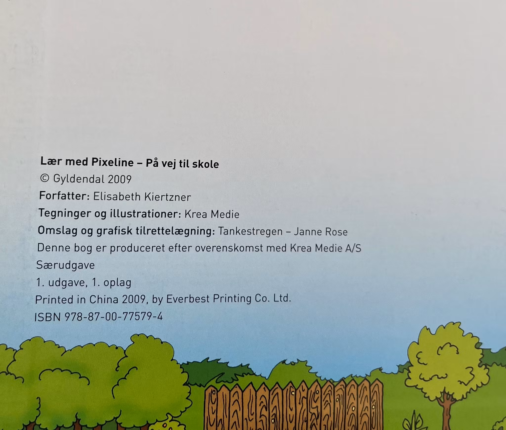 Pixeline-bog med titlen "Lær med Pixeline: På vej til skole" udgivet af Gyldendal. Bog