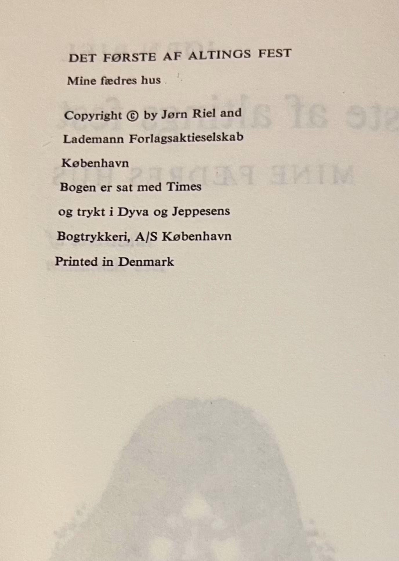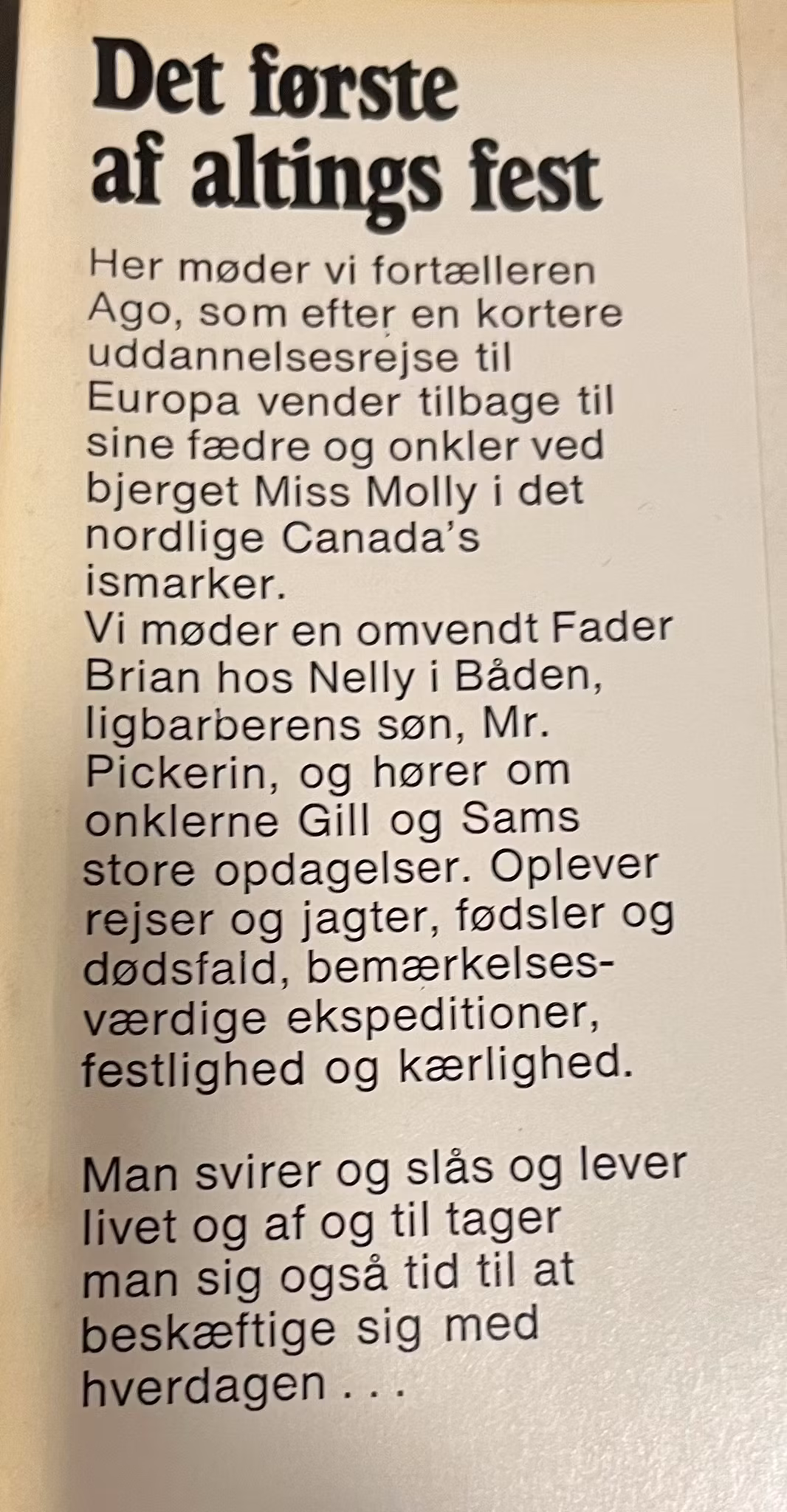 Det første af altings fest. Tredje bind i serien: Mine fædres hus. Kreds af muntre fortællinger fra arktiske egne – nord for polarcirklen i Canada blandt enuitter, indfødte amerikanere og hvide, som er pelsjægere. Fortælleren er drengen Agojaraq, som besidder en umiddelbar opfattelse af sin omverden. Illustreret af Des Asmussen.
