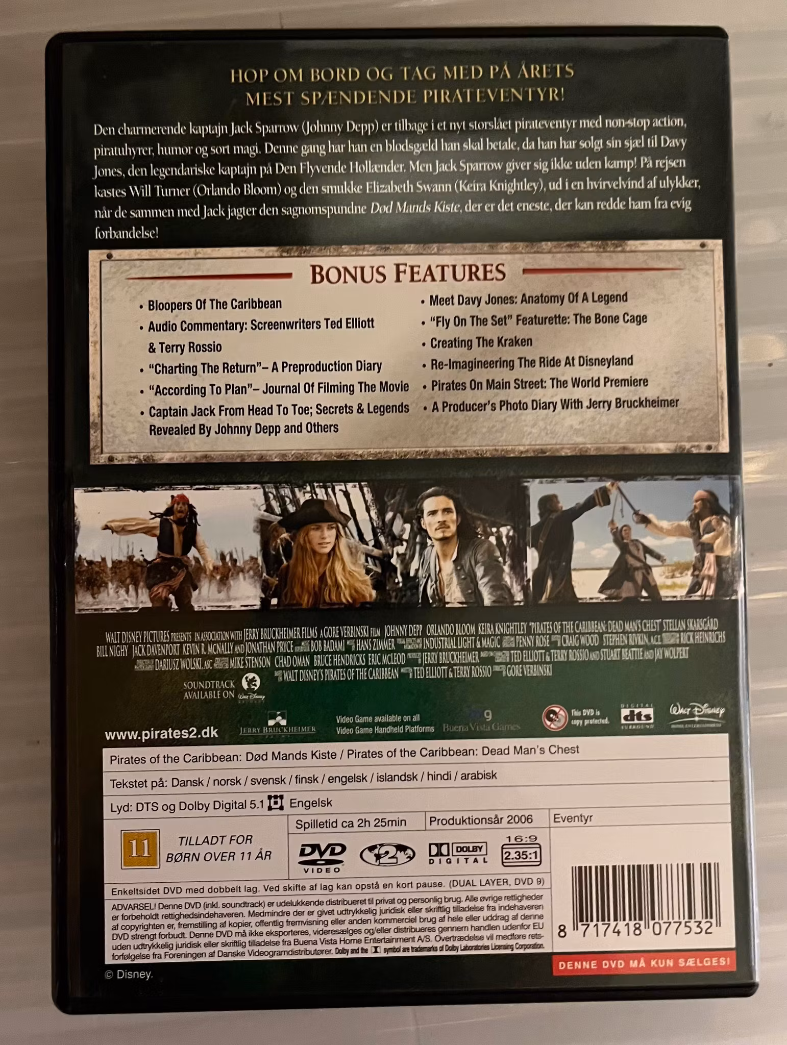 Død mands kiste - dvd film - 2-disc special edition. Den charmerende kaptajn Jack Sparrow (Johnny Depp) er tilbage i et nyt storslået pirateventyr med non-stop action, piratuhyrer, humor og sort magi. Denne gang har han en blodsgæld han skal betale, da han har solgt sin sjæl til Davy Jones, den legendariske kaptajn på Den Flyvende Hollænder. Men Jack Sparrow giver sig ikke uden kamp! På rejsen kaster Will Turner (Orlando Bloom) og den smukke Elizabeth Swann (Keira Knighley), ud i en hvirvelvind af ulykker, når de sammen med Jack jagter den sagnomspundne Død Mands Kiste, der er det eneste, der kan redde ham fra evig forbandelse !