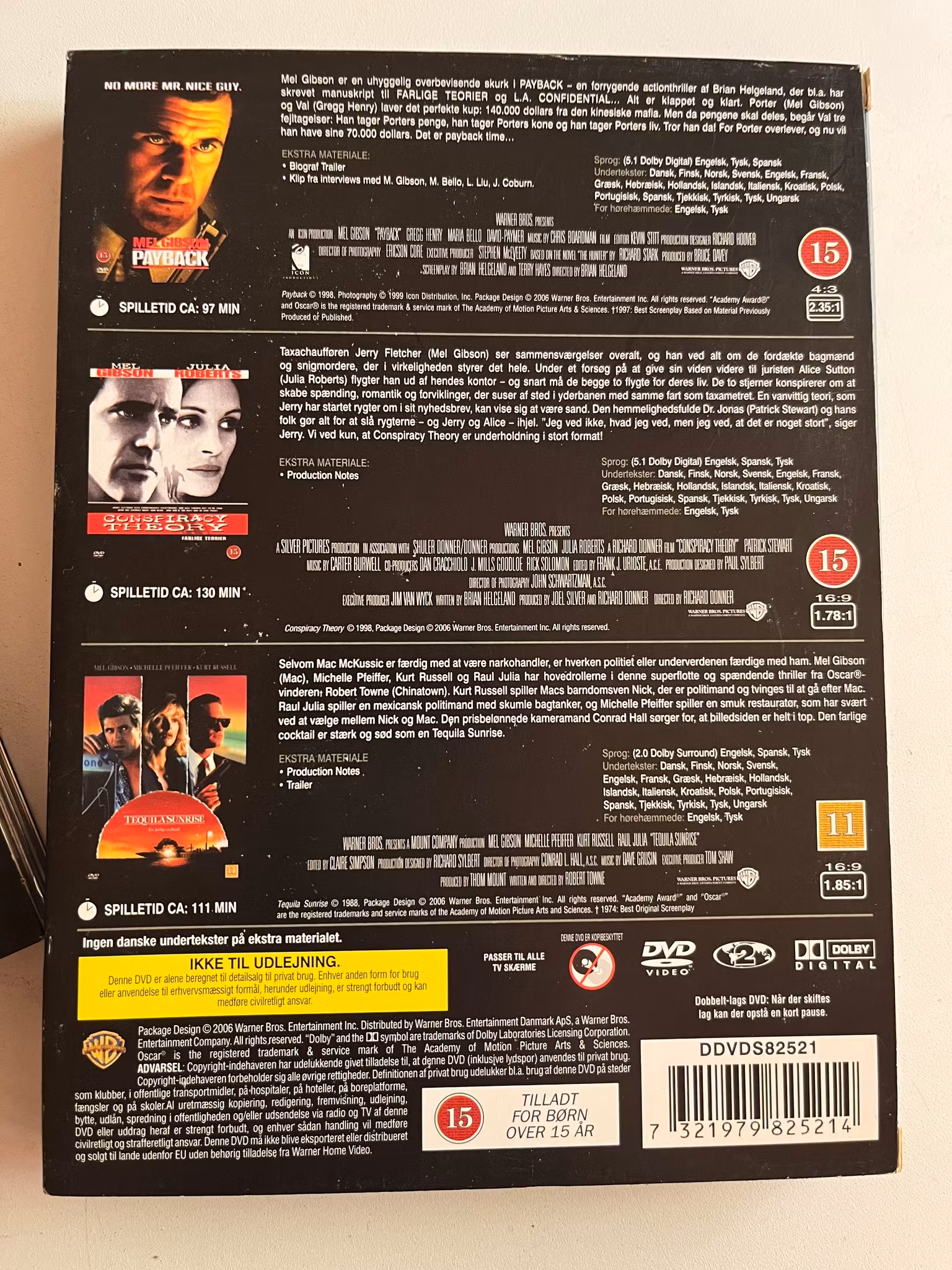 DVD Box - Mel Gibson Collection 25,- PaybackConspiracy TheoryTequilaSunriseTilladt fra 15 år På lager Tilføj til kurv Lagersaldo: 1 Del Information Anmeldelser PaybackConspiracy TheoryTequilaSunriseTilladt fra 15 år