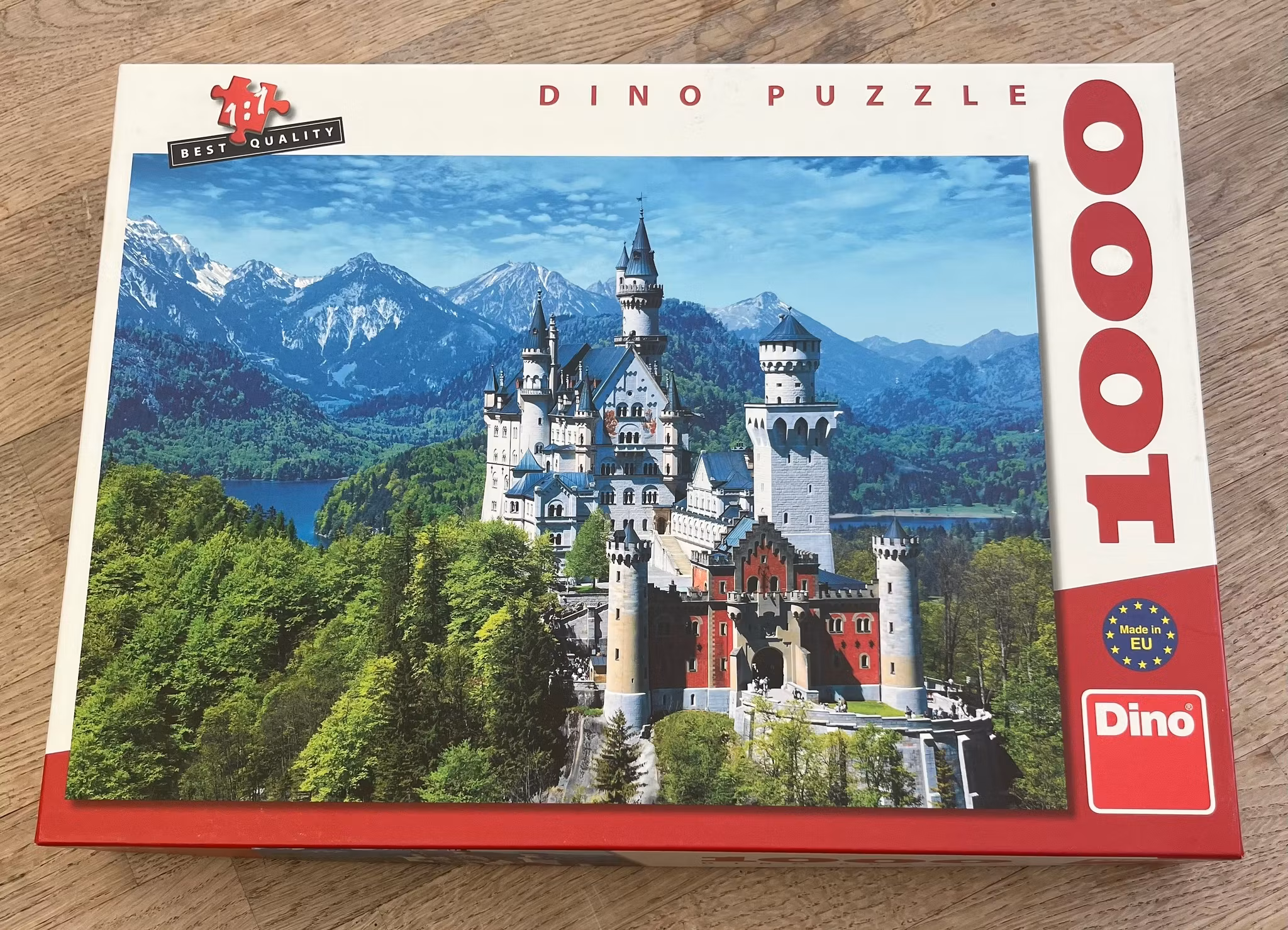 Dino Puzzle med 1000 brikker, der forestiller Neuschwanstein Slot i Tyskland.